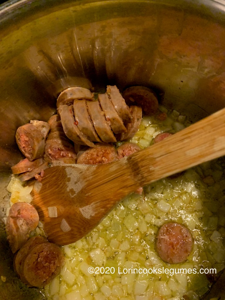 For this batch I used canned beans and Johsonville Spicy Italian Sausage*. I simmered the sausage in boiling water for a few minutes before slicing it and adding it to the pot- I could have gone a while longer as it was still pretty raw in the middle when I cut into it, but I figured It was getting cooked more in the final dish. Next time I will likely try some kind of Salami for a different flavor.
