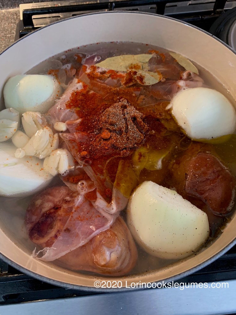 Remove meats and sausage from pot and set them aside to cool slightly. Remove onion, garlic cloves and bay leaves and discard. When meat is cool enough to handle, remove and discard any skin or bones, and cut it into bite sized pieces. Return to the pot, stir, and season to taste with salt and pepper.