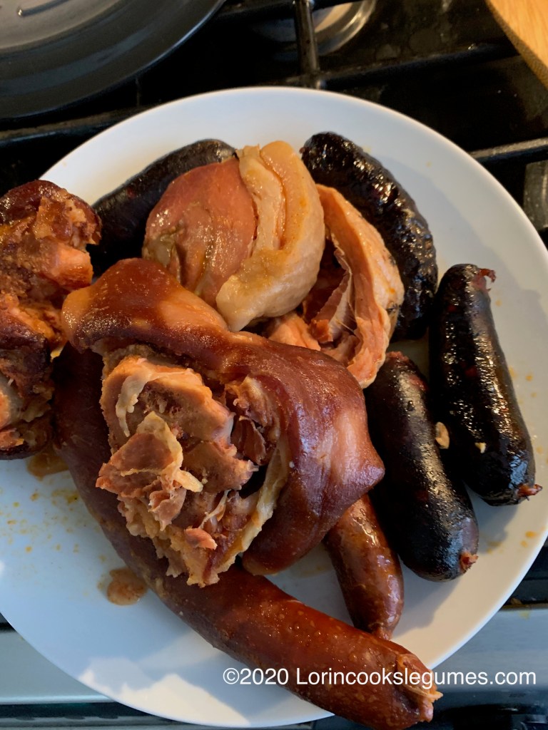 Cover beans with 8 ½ cups of cold water. Leave all the meats whole or in large chunks and add all of them except the morcilla to the pot, along with the onion, garlic, bay leaves, spices and olive oil. (If you are using canned beans reduce water to 6 cups, simmer the meats on their own, and add the beans when you add the morcilla.)