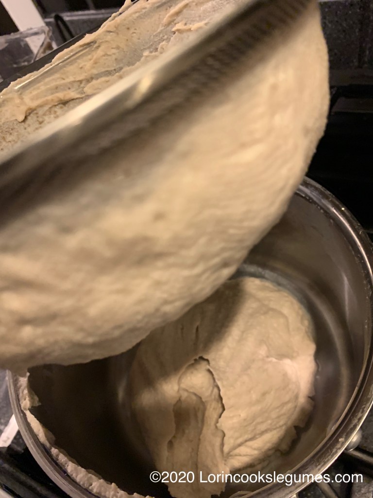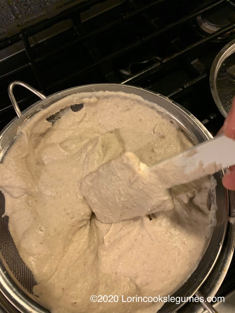 Once beans have cooled, Drain them and place in a blender or food processor with one can of the coconut milk and puree until very smooth. Pour into a fine mesh strainer over a heavy bottomed pot. If it is too thick, push it through with a spoon until only the dry chaff is left.