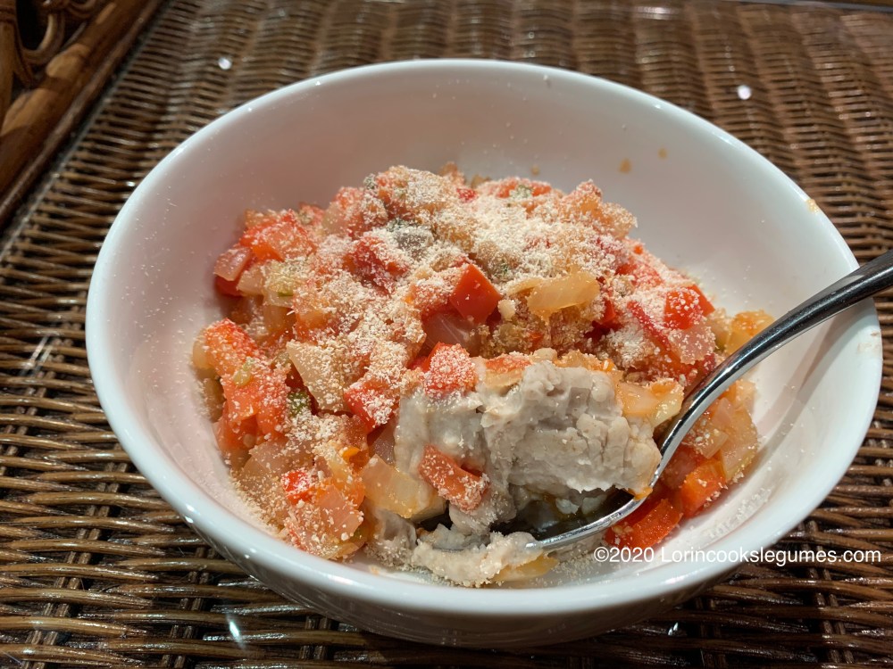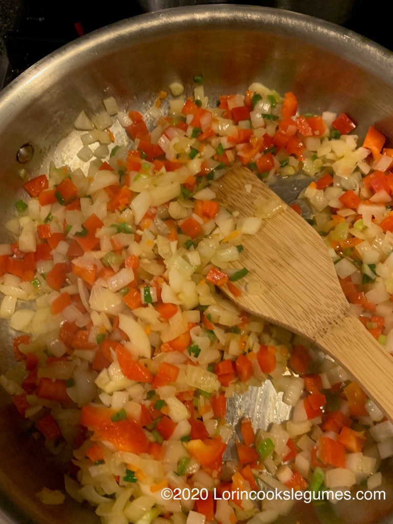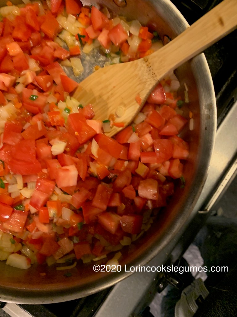 Meanwhile, heat olive oil in a skillet over medium heat, and saute onion, garlic, scallion and peppers until soft, about 5 minutes. Add tomato and cook 5-10 minutes until soft and flavors come together. Add salt to taste.
