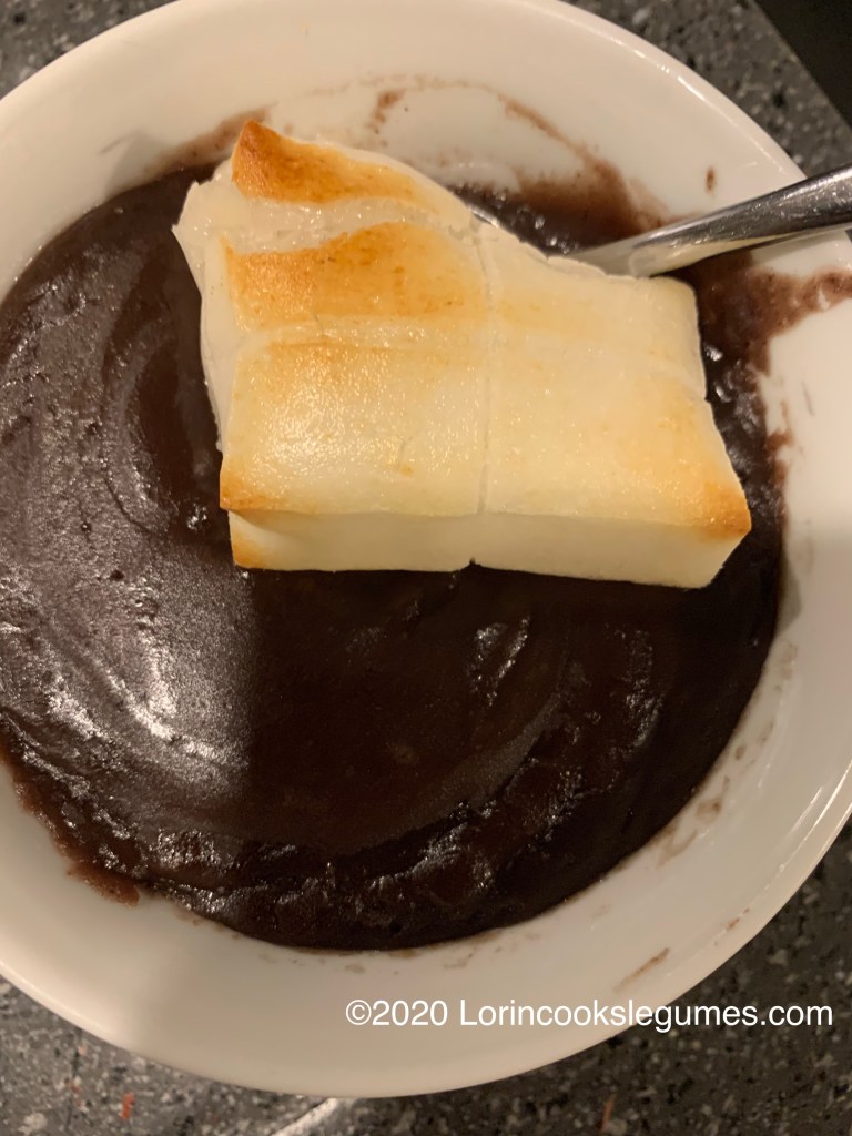 Cook mochi in a toaster oven until brown and starting to puff up. Place in bowl and ladle beans over top.