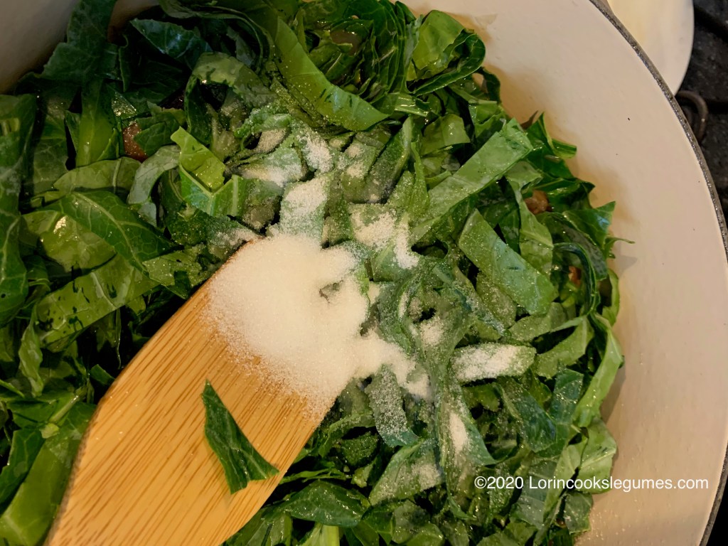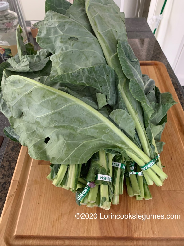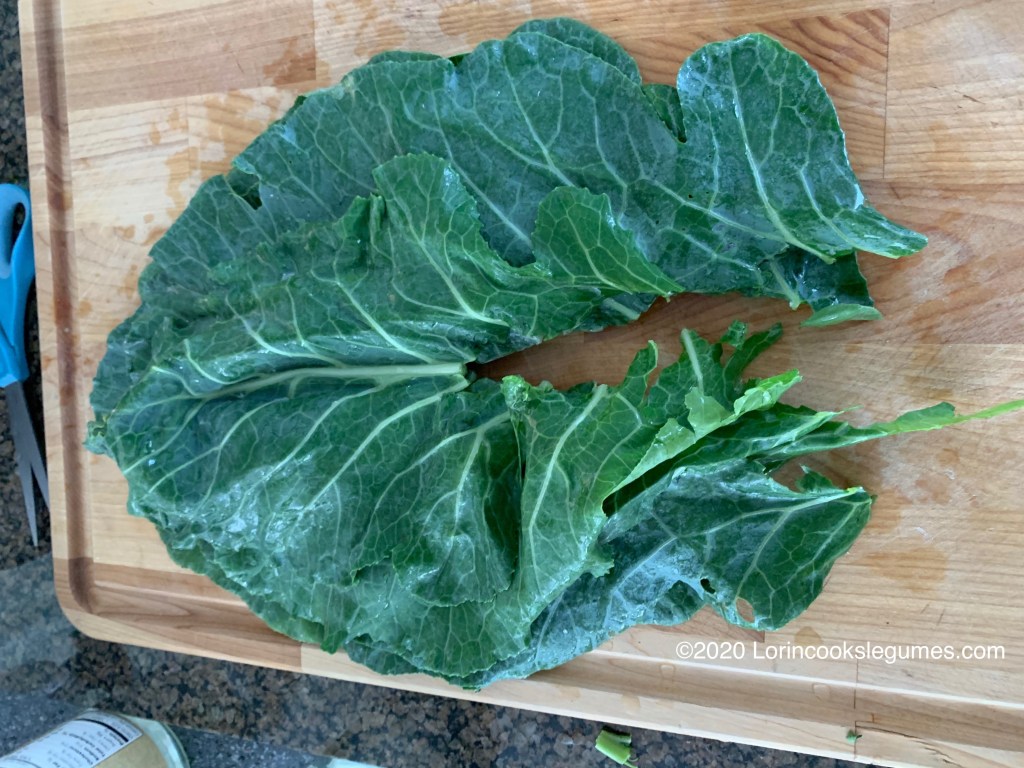 Most recipes I looked at emphasized how collard greens are gritty, and the need to wash them thoroughly. If you’ve grown your own that’s likely to be true. Modern grocery store produce usually doesn’t have that problem, but it’s worth giving them a good rinse anyway- you don’t know what else might be on them.