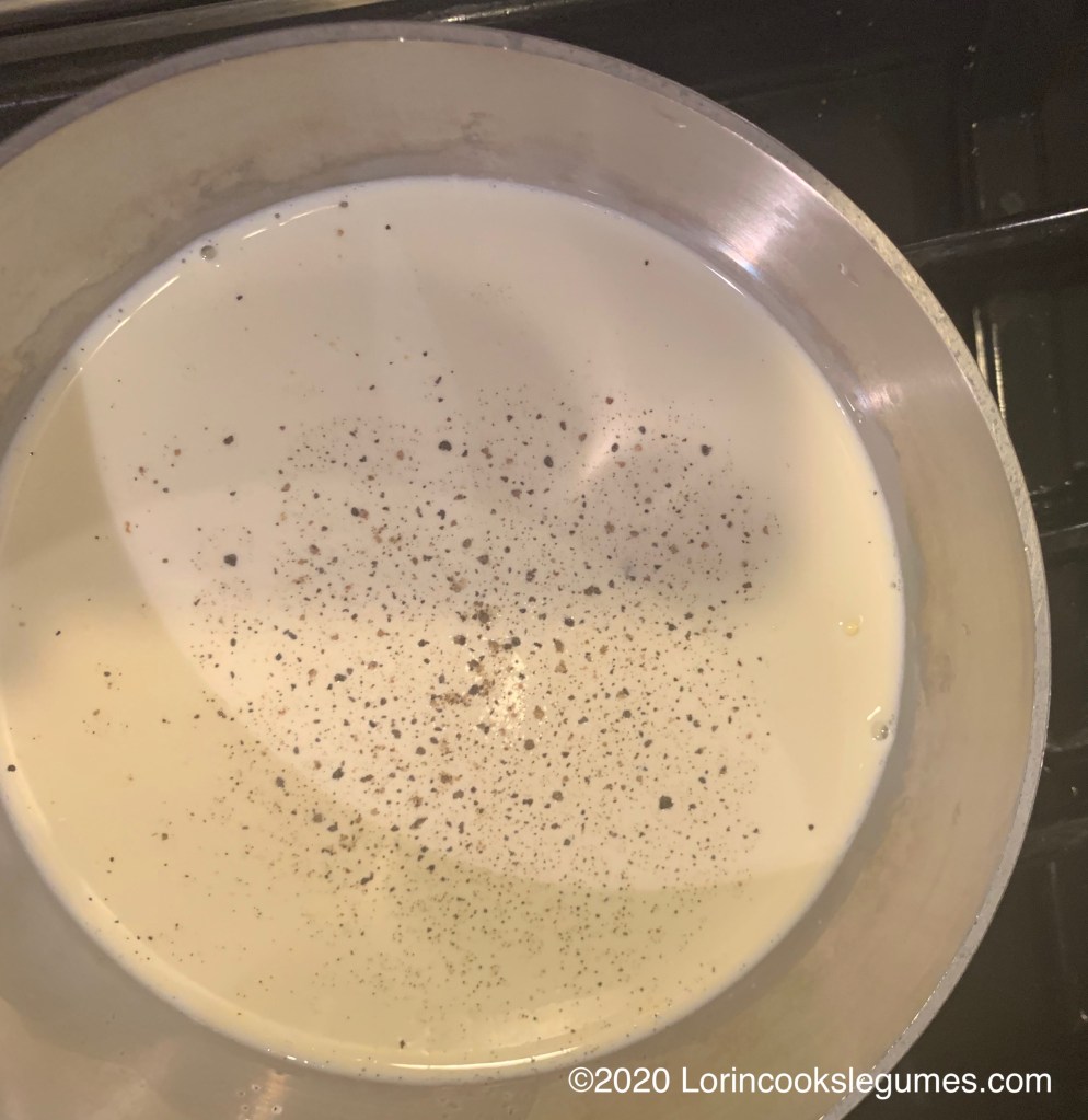 Place milk, cream salt and pepper in a small pan and gently heat. Do not boil.