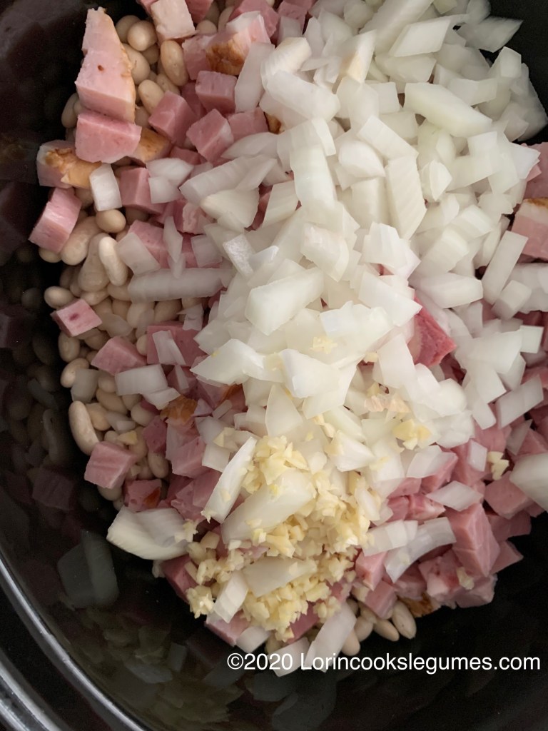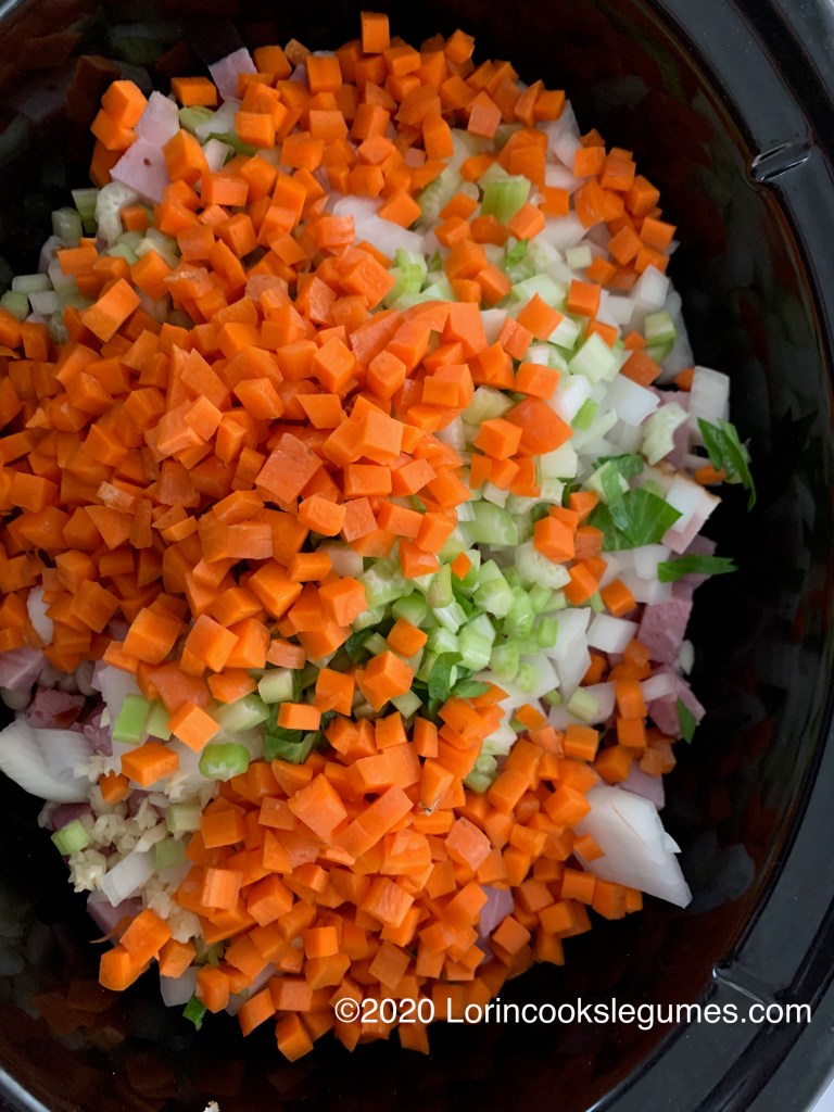 Drain the beans and place them in a slow cooker with ham, vegetables, broth, water and seasonings. Cook on high until boiling, then reduce to low and cook until beans are tender and the broth starts to thicken, about 8 hours total.