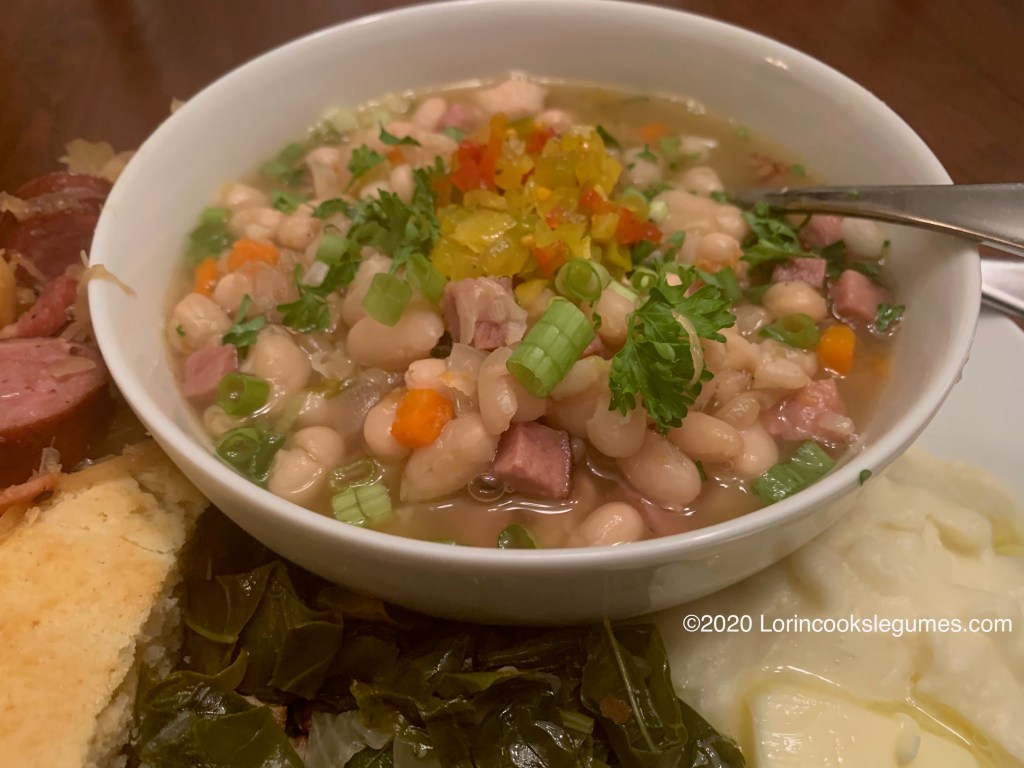 White beans — Great northern beans and Navy beans are often used to make a soup bean dish. This became more common as residents of rural areas began to rely more on store-bought beans and could afford more variety. This dish is typically referred to as “white beans” although it is occasionally called soup beans. Along with the beans, white beans are typically cooked in the juice of a country ham, often with the ham bone or ham included in the dish. As such, this dish is a prized part of holiday meals, when hams are baked. White beans are sometimes cooked with pork fat like brown soup beans, although this is less common. White beans carried an air of sophistication because they were first available in towns to people who could afford more than one type of bean and ham, as opposed to poorer rural people who often raised only brown beans.