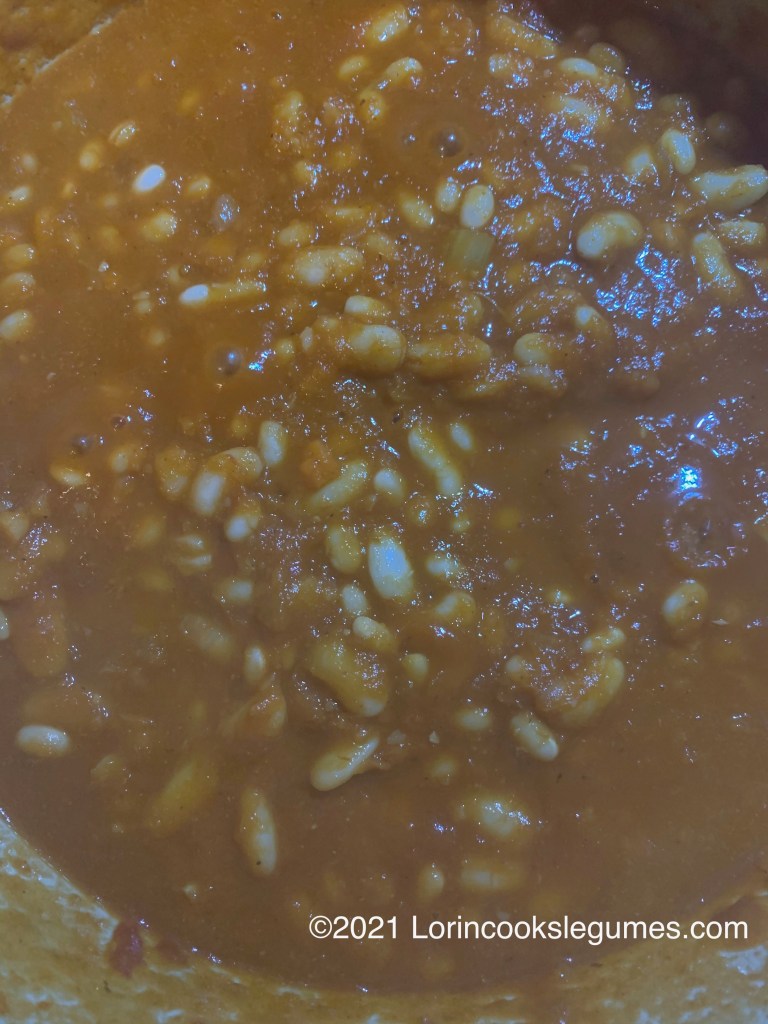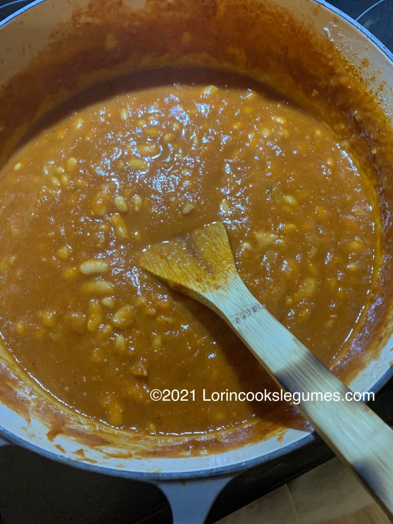When beans are tender, drain and add to sauce. Bring to a boil and simmer, uncovered, for 50-55 minutes, until sauce is thickened slightly and beans are cooked. Combine cornstarch with ¼ cup cold water and stir to dissolve any lumps. Pour slurry into the beans and stir until sauce thickens. Remove from heat and serve.