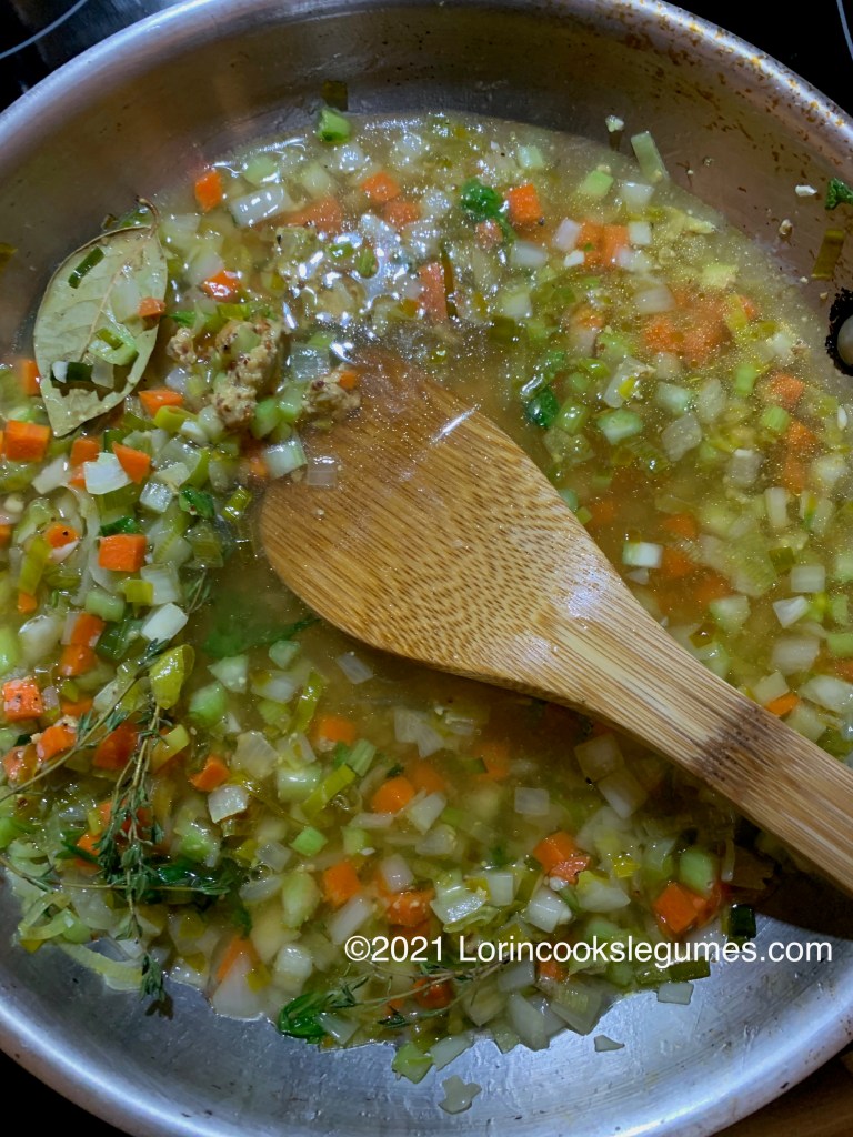 Put olive oil and leeks in an oven proof skillet. Place over low heat and sweat for 15-20 minutes, until leeks are very soft. Raise heat to medium and add onion, celery and carrot. Saute for 5 minutes or so, until vegetables start to soften. Add garlic and cook for another minute or two.