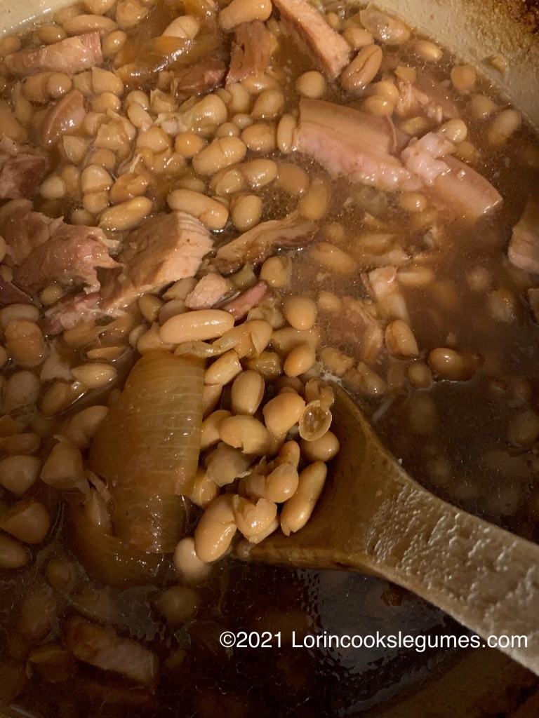To cook indoors, place the pot of beans in a 300F oven for about 4 ½ hours.