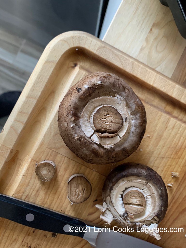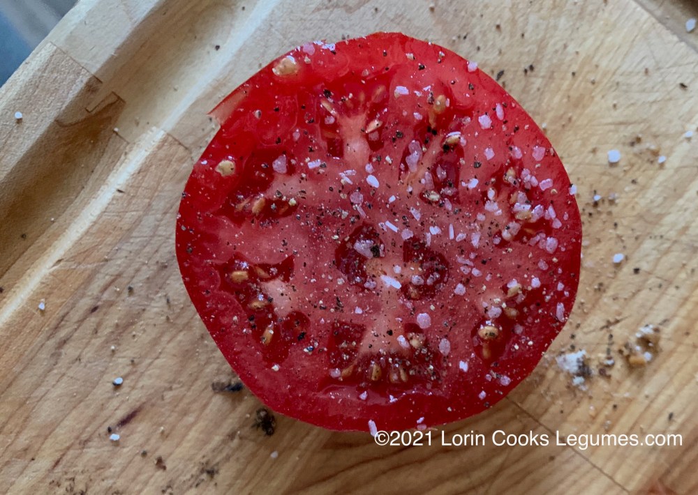 Meanwhile, trim mushroom stems level with caps. Heat a small non-stick skillet over medium heat and add a little oil and the tablespoon of butter. Add mushrooms, open side up, and season with salt and pepper. Cook for 5 minutes or so. Season the tomato and add to the pan, cut side down. Give the mushrooms a flip and cook for 2-3 minutes. Flip tomato and cook another 2-3 minutes.