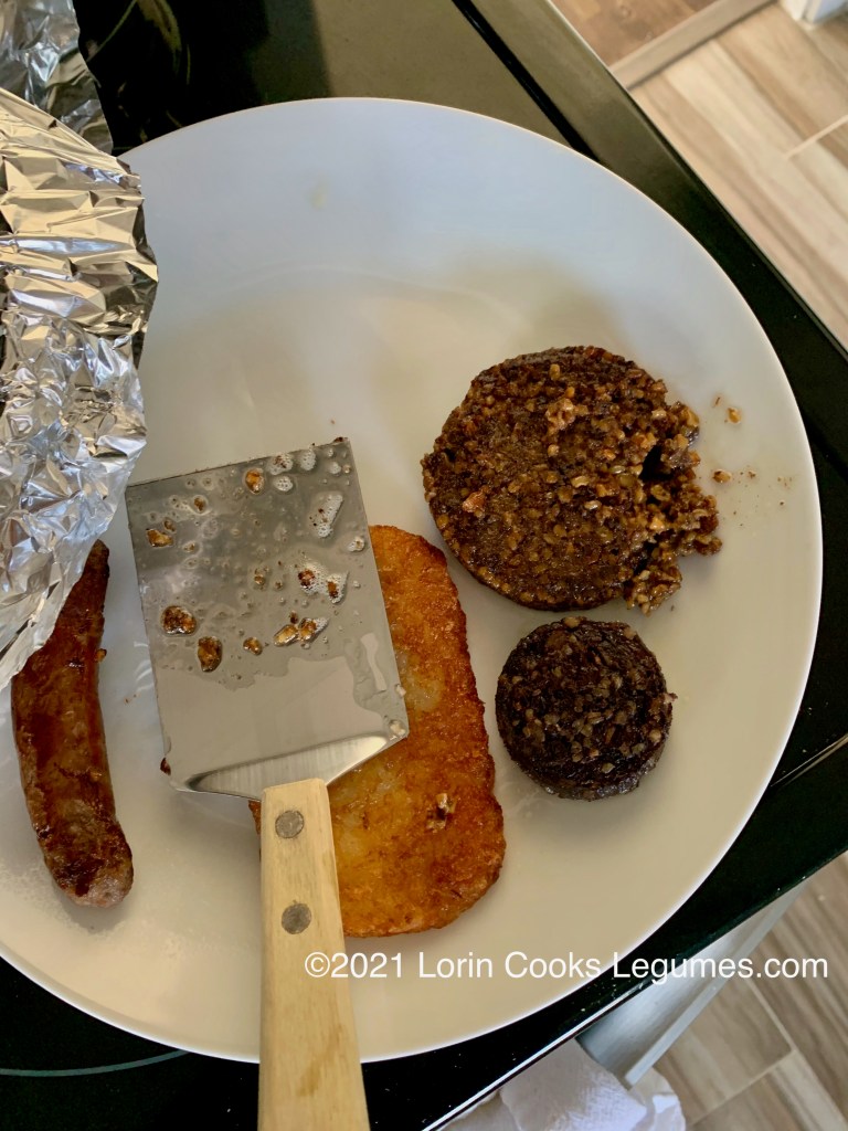 In addition to the tattie scone, I’ve also included hash browns. I was thinking that the hash browns probably made it into my recipe from looking at recipes that used them instead of the scone, but looking back at the spreadsheet I work from to create my recipes I see that all recipes that included hash browns did so in addition to the scone, so I’m not stretching things there. One interesting side note about hash browns. I don’t know if it’s a midwest thing or true across America, but I mostly see hashbrowns sold as loose grated potato- usually frozen, although in the restaurant industry I encountered freeze-dried. I’ve noticed in doing recipe research that people from the rest of the world seem to use the word hash browns to refer to a potato patty. I think the closest common thing here is likely Tater-Tots, maybe Taco John’s Potato Olés. I did manage to find hash brown patties at the grocery store, but there was only one option compared to several brands of loose ones.