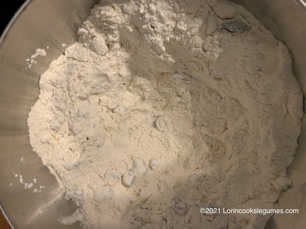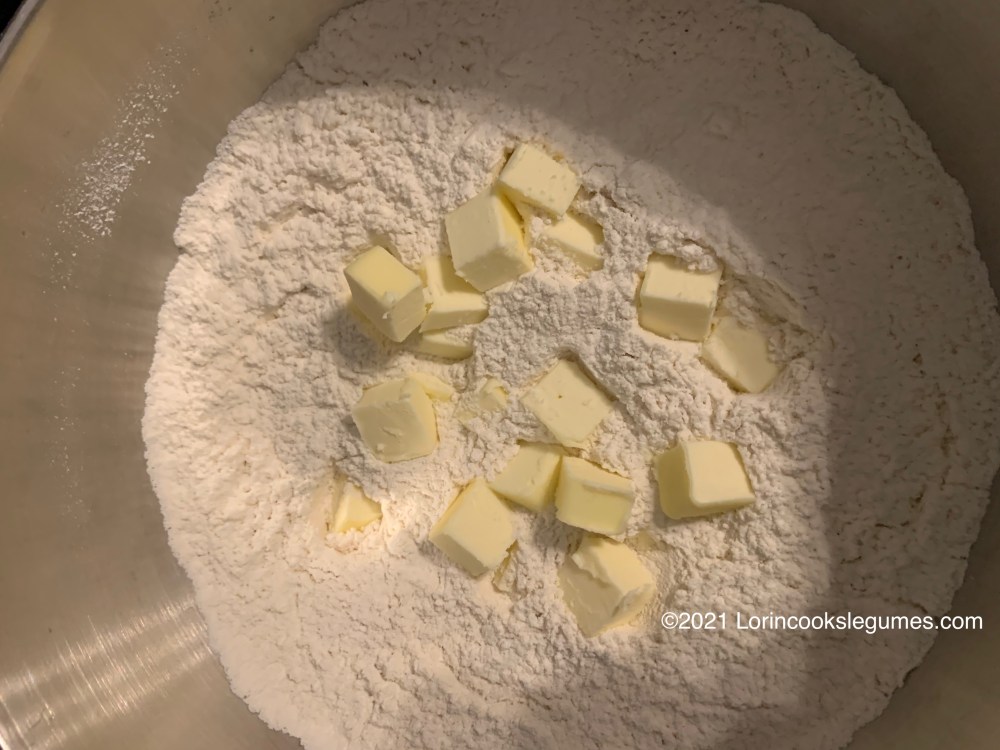 Add the butter and cut it with a pastry blender, two forks or your fingers until butter resembles pea sized crumbs. This is a flour heavy mixture so it won’t be as uniform as pie crust, but do your best.