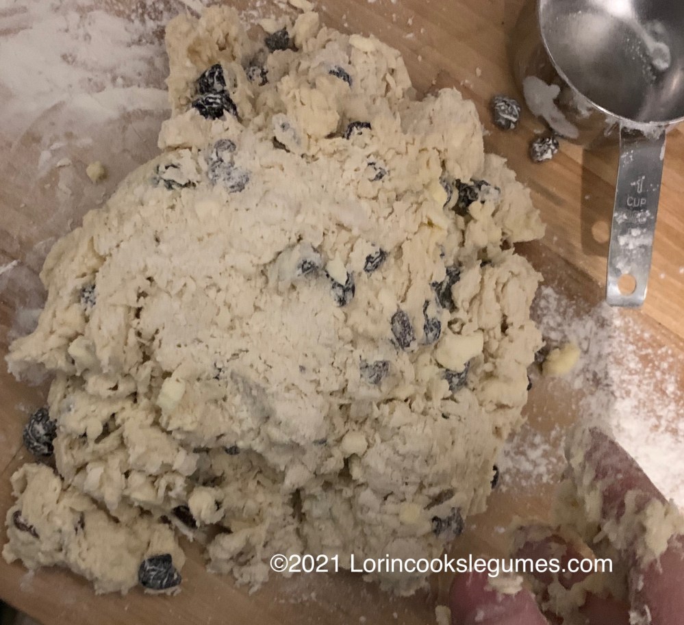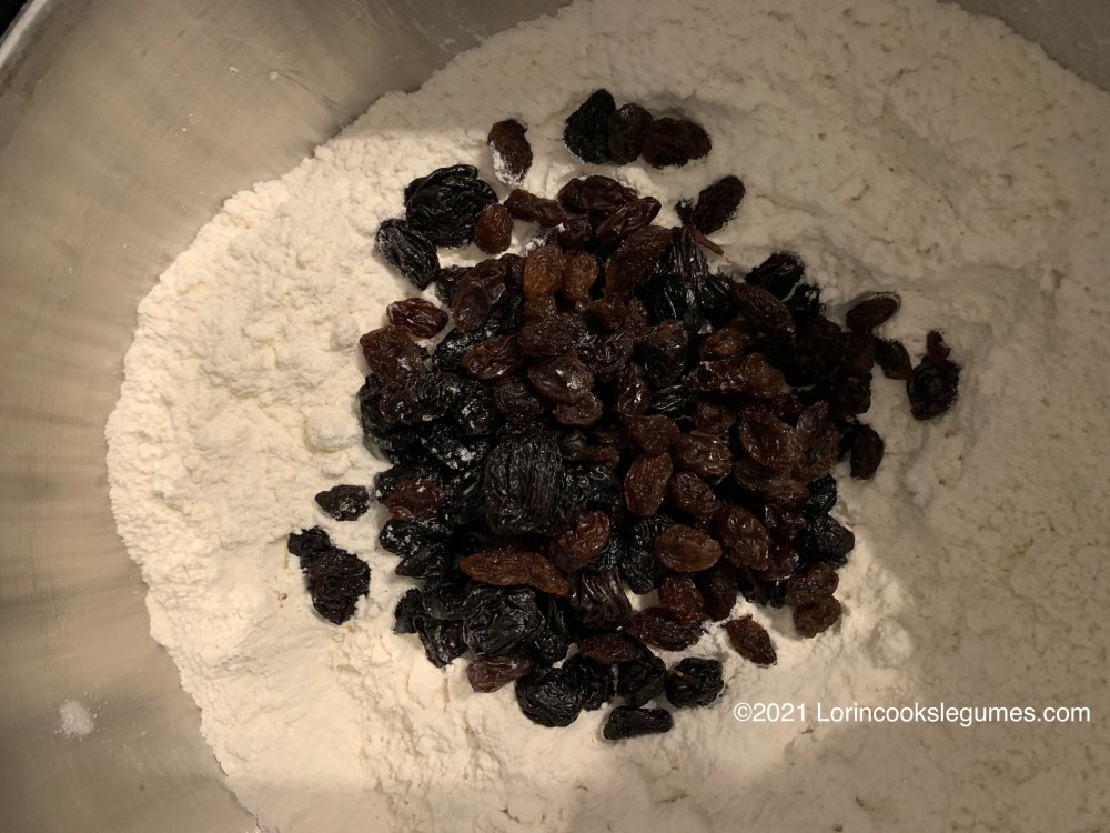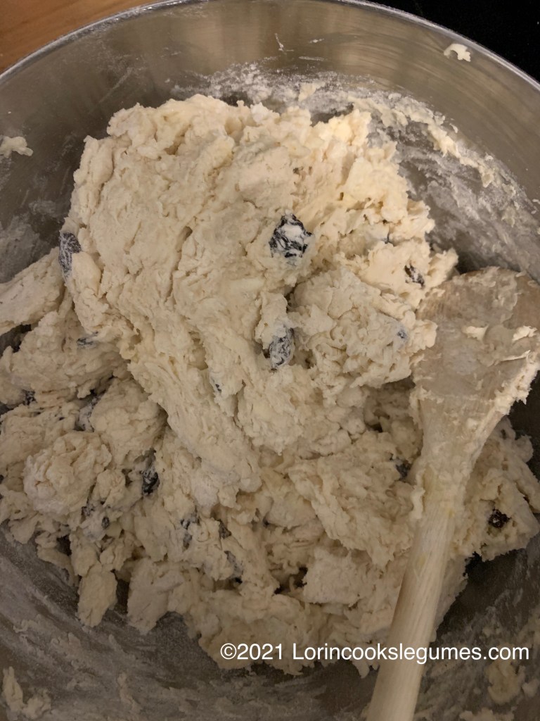 Add the raisins and toss until they are distributed and coated with flour. Make a well in the center and pour in the buttermilk mixture. Mix until a crumbly dough forms.