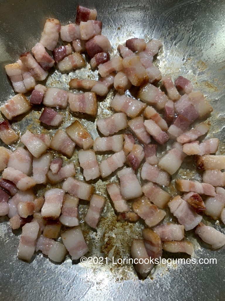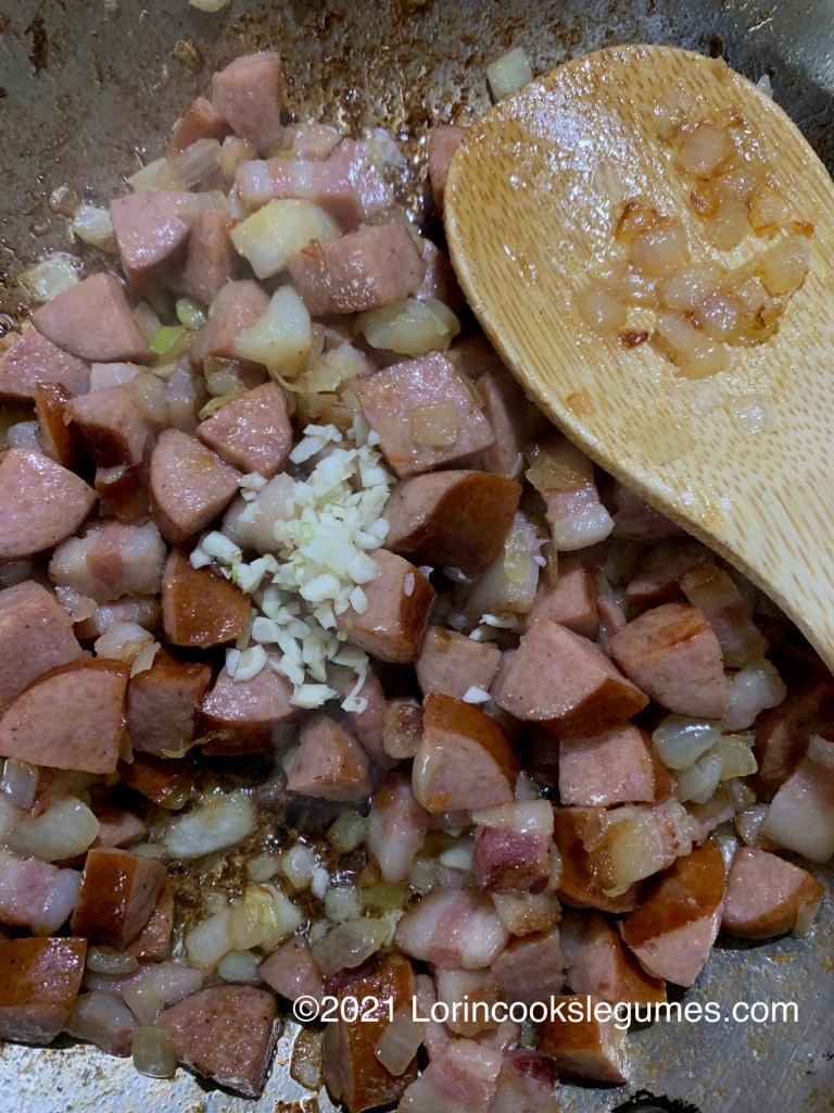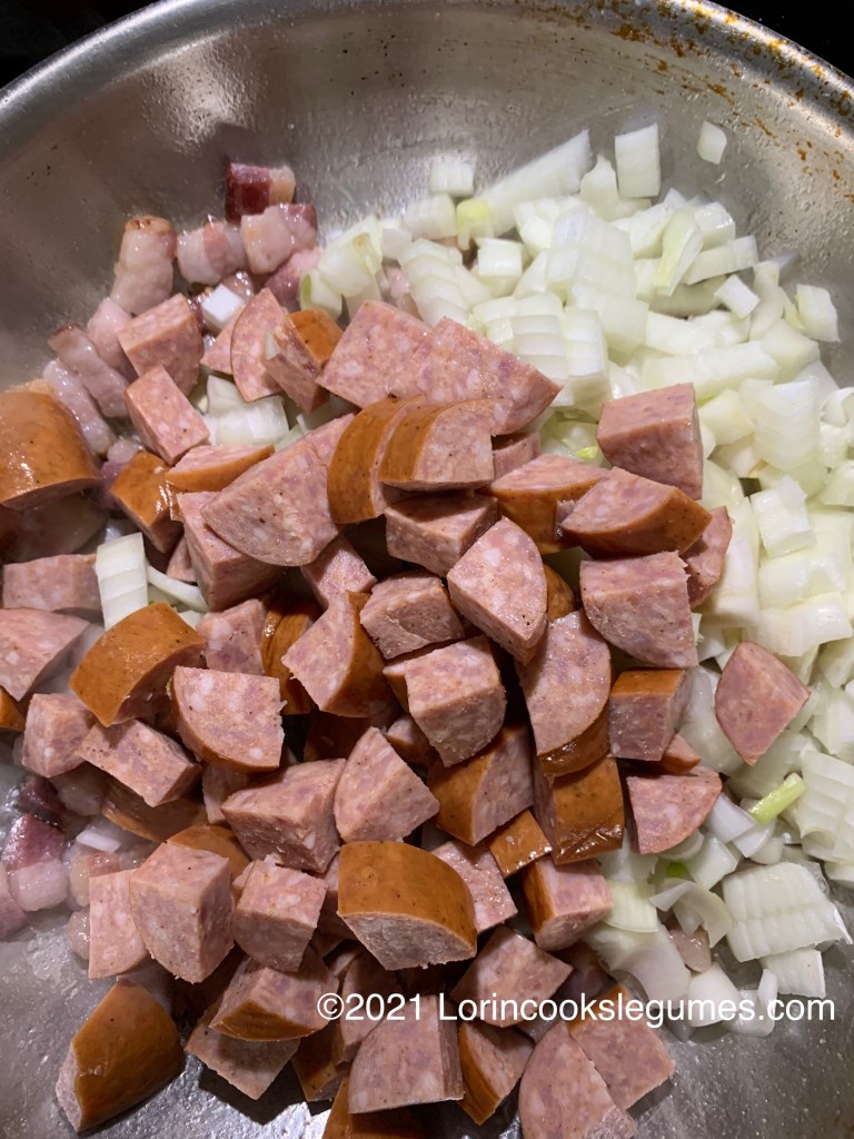Meanwhile, place bacon in a skillet and place over medium heat. When fat starts to render, add onion and kielbasa. Sauté for 10-15 minutes, until onion and kielbasa begin to caramelize.