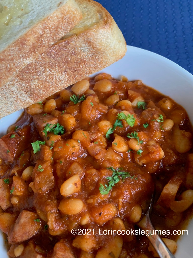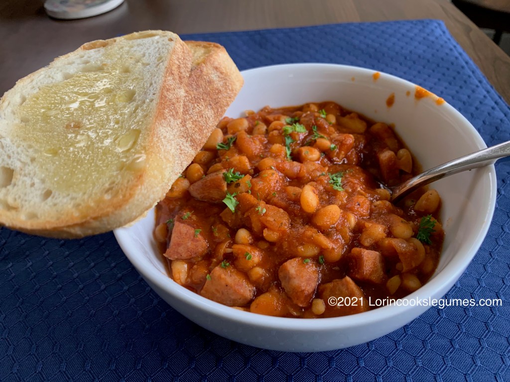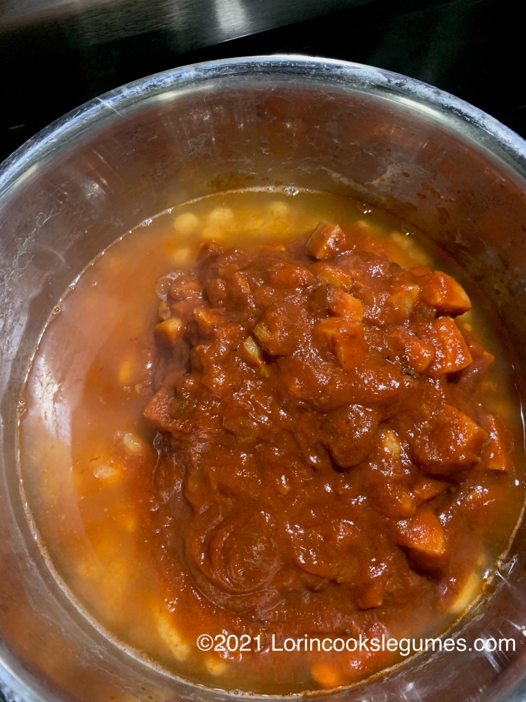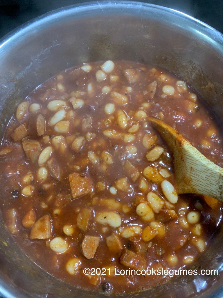When your beans are soft there should be just enough liquid left to barely cover the beans- if there is too much liquid, remove the excess. Add the tomato-kielbasa mixture to the beans, along with seasonings. Simmer, uncovered, for another 30-60 minutes.