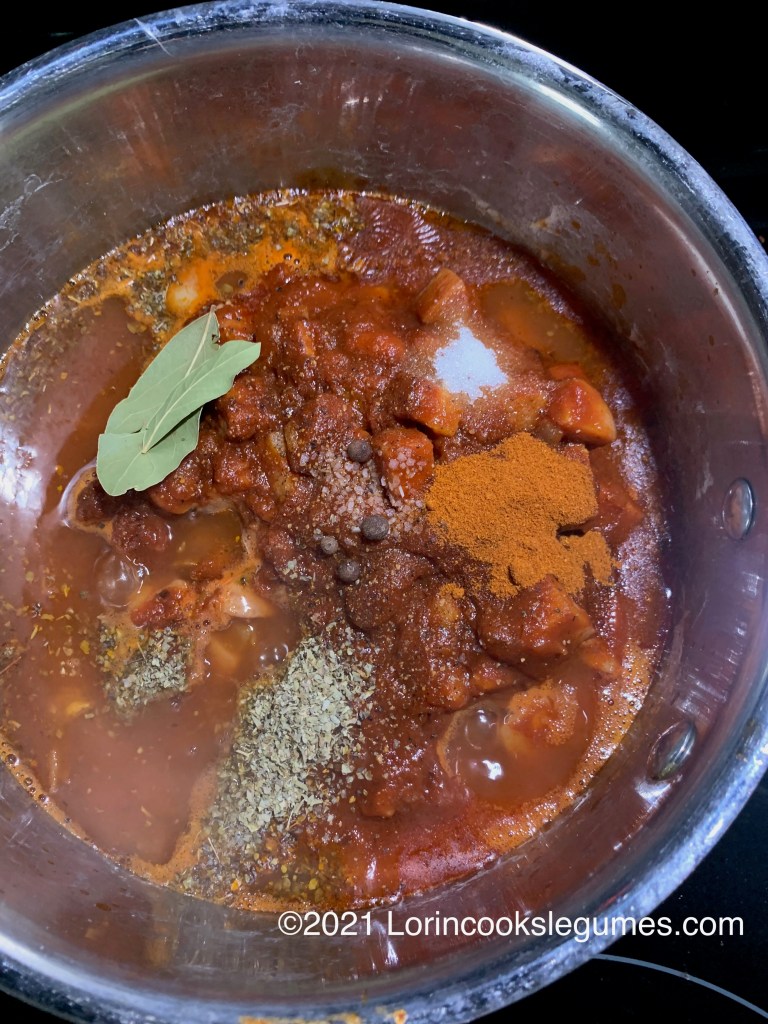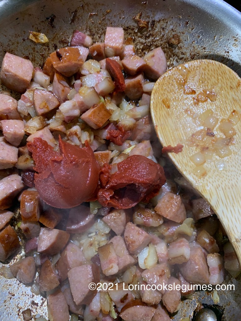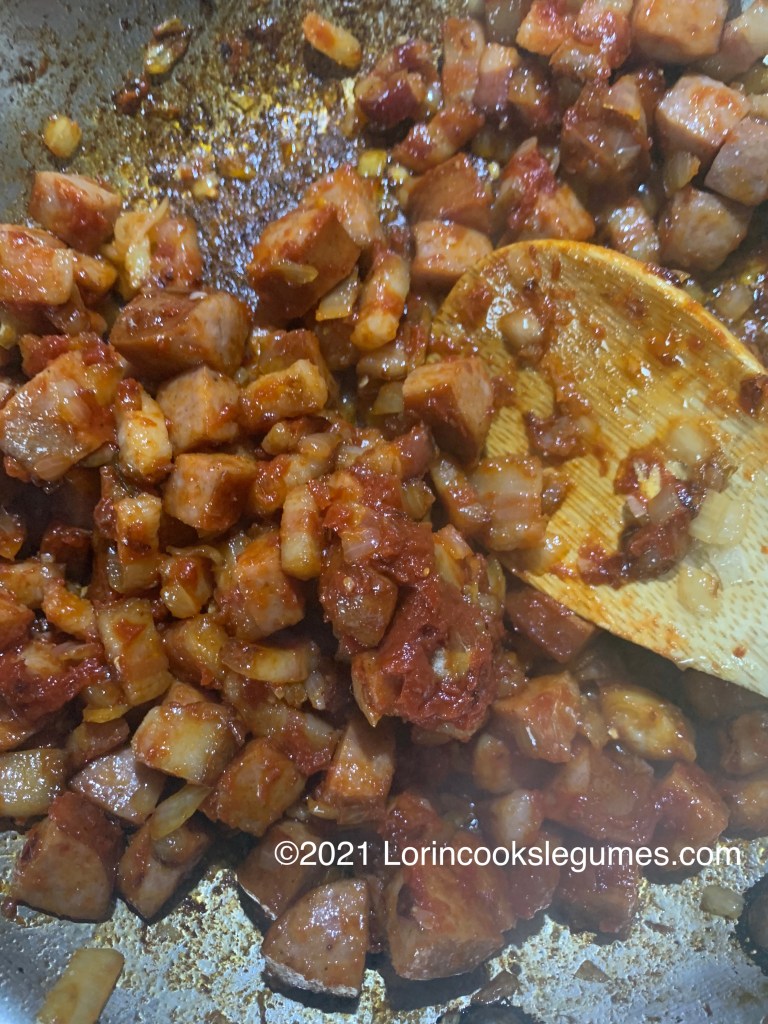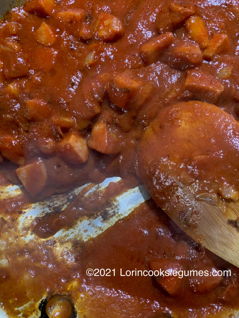 When your beans are soft there should be just enough liquid left to barely cover the beans- if there is too much liquid, remove the excess. Add the tomato-kielbasa mixture to the beans, along with seasonings. Simmer, uncovered, for another 30-60 minutes.