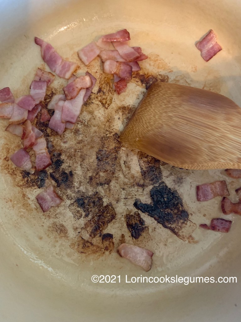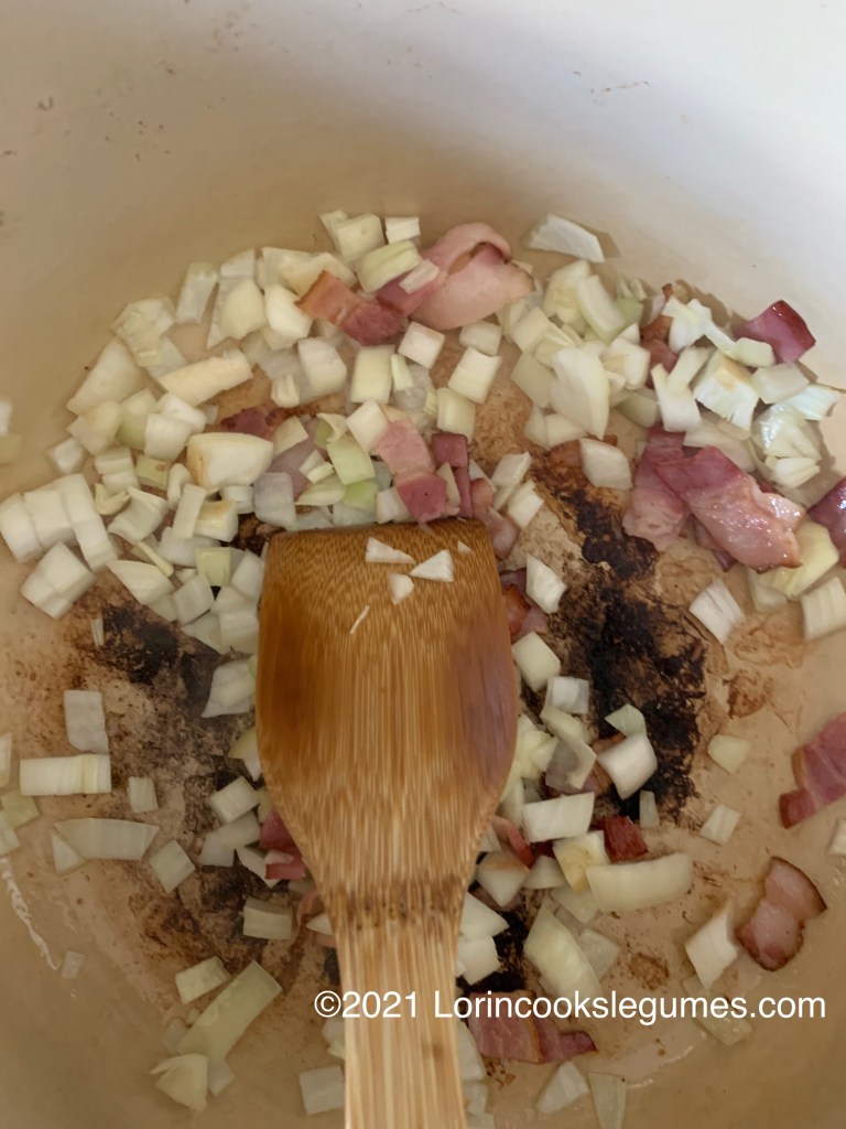 Put bacon in a dutch oven or large skillet and place over medium-low heat. Cook until some of the fat has rendered but bacon is not crispy. Add onion and sauté 5-10 minutes until onion begins to brown.