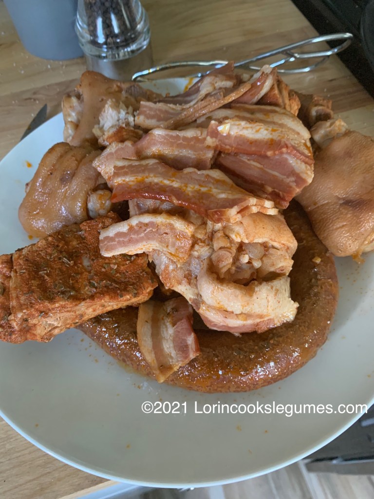 Place marinated pork in a large pot or dutch oven along with bacon and chorizo. Cover with water and bring to a boil. Reduce heat to a simmer, cover and cook for about 75 minutes, until meat is tender. Remove meat from pot and set aside. You can discard the trotter or pick the meat off the bones.