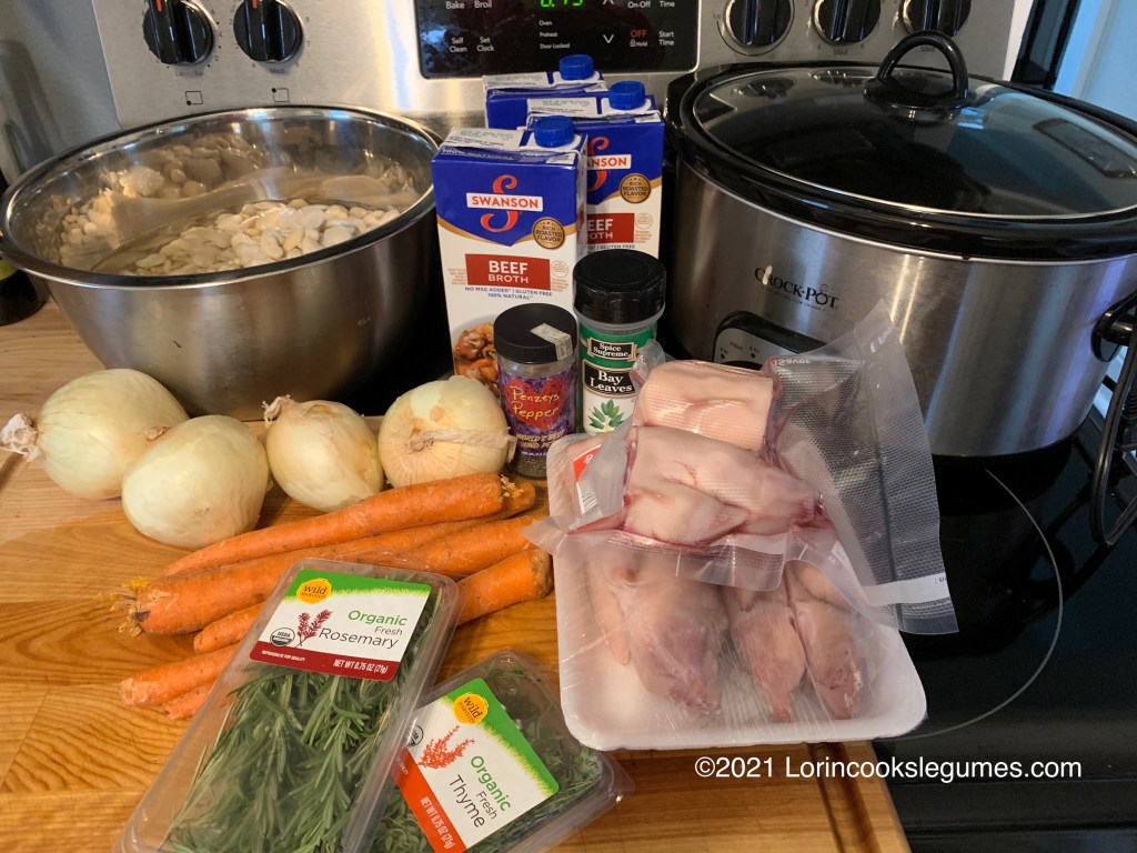 Drain the beans, and place in your slow cooker. Add onion, carrot, pork trotters or hocks, black pepper, bay leaves, thyme, rosemary and stock. If necessary add additional water so that there are a couple inches of liquid covering the beans.Cook on high for about 3 hours, until they are boiling nicely. Reduce heat to low and cook for another 13-14 hours. Check occasionally and add more boiling water if needed to keep everything well submerged until the last couple hours of cooking.