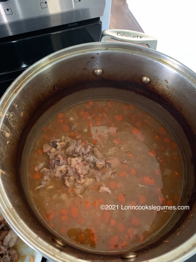 During the last hour of cooking remove the trotters and pick the meat off the bones. Discard bones, skin and gristle and add the meat back to the beans. Add salt and adjust seasoning to taste.