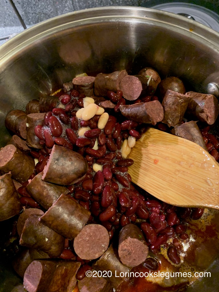 Add beans and blood sausage and continue to cook for another 20-30 minutes until everything is tender and flavors have blended. Once you have added the blood sausage try to stir gently to avoid breaking up the sausage.