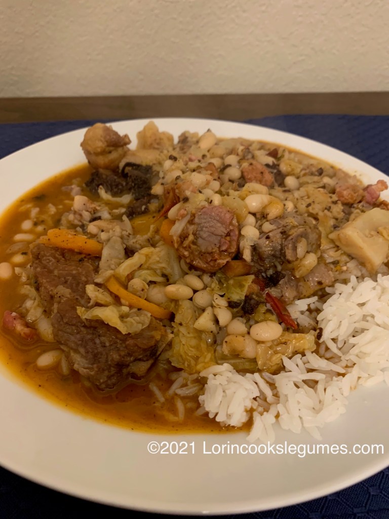 Of course, like any many other traditional peasant foods, it morphed as it migrated. In northern Portugal red kidney beans are the bean of choice, but futher south white beans were more commonly grown, so that’s what they used. Similarly the types of sausage would vary from region to region, and the vegetables would vary depending on what was available.