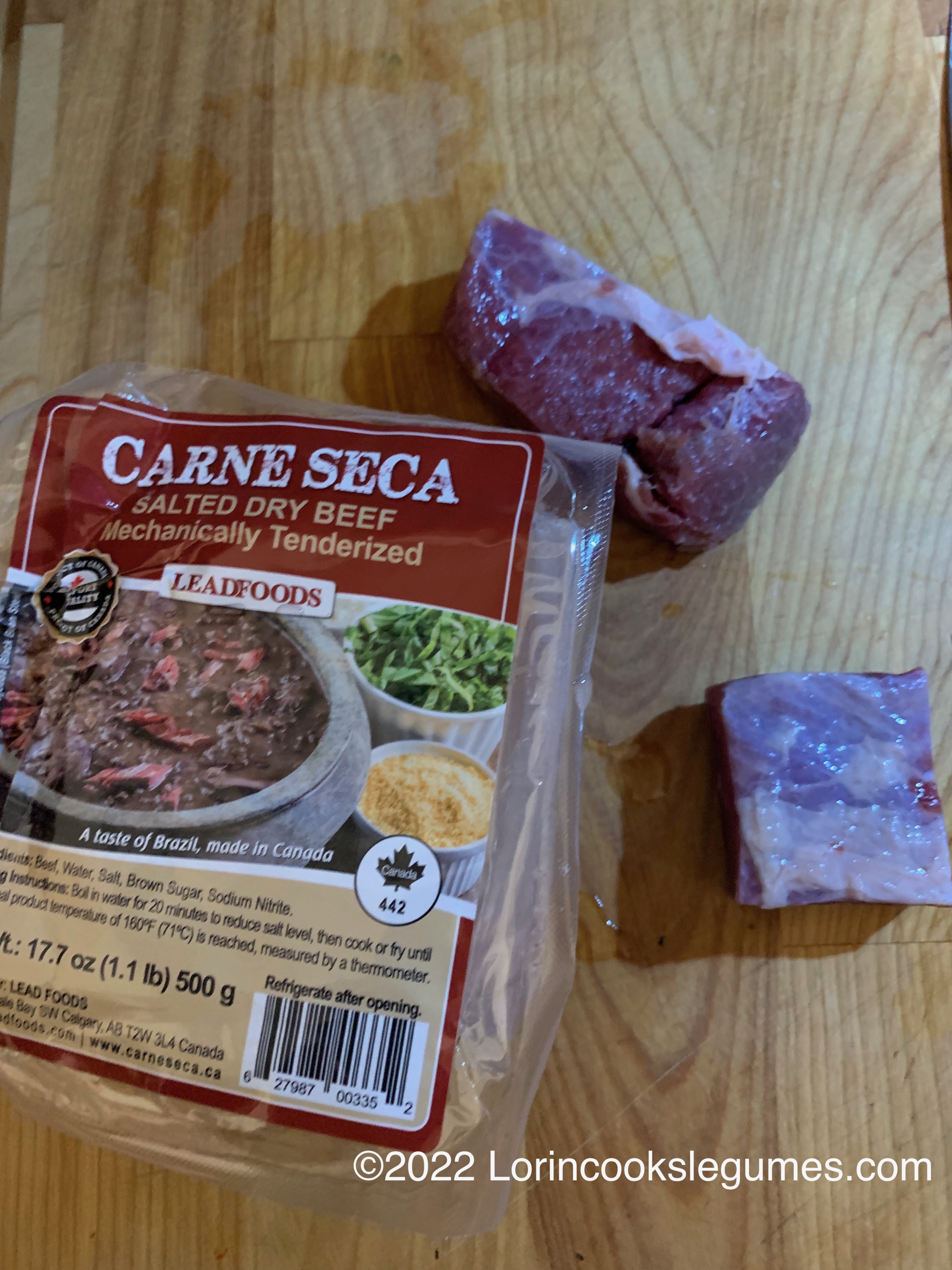 Besides looking at subtle variation in recipes, I also learned that I probably gave some inaccurate information in my original recipe, regarding carne seca. While the english language sites I looked at mostly suggested beef jerky as a substitute, and the product I bought for that recipe was basically shredded jerky, when I dug a little deeper into what Brazilian carne seca is, I found out that while it’s a “dried salted beef” product, it’s not generally as fully dried as jerky, and corned beef would actually be a better substitute. I bought this product*, made in Canada, from Amazon, and I would agree. The texture of carne seca is firmer, but for that serious salty, beefy punch, corned beef is pretty spot on flavor wise.