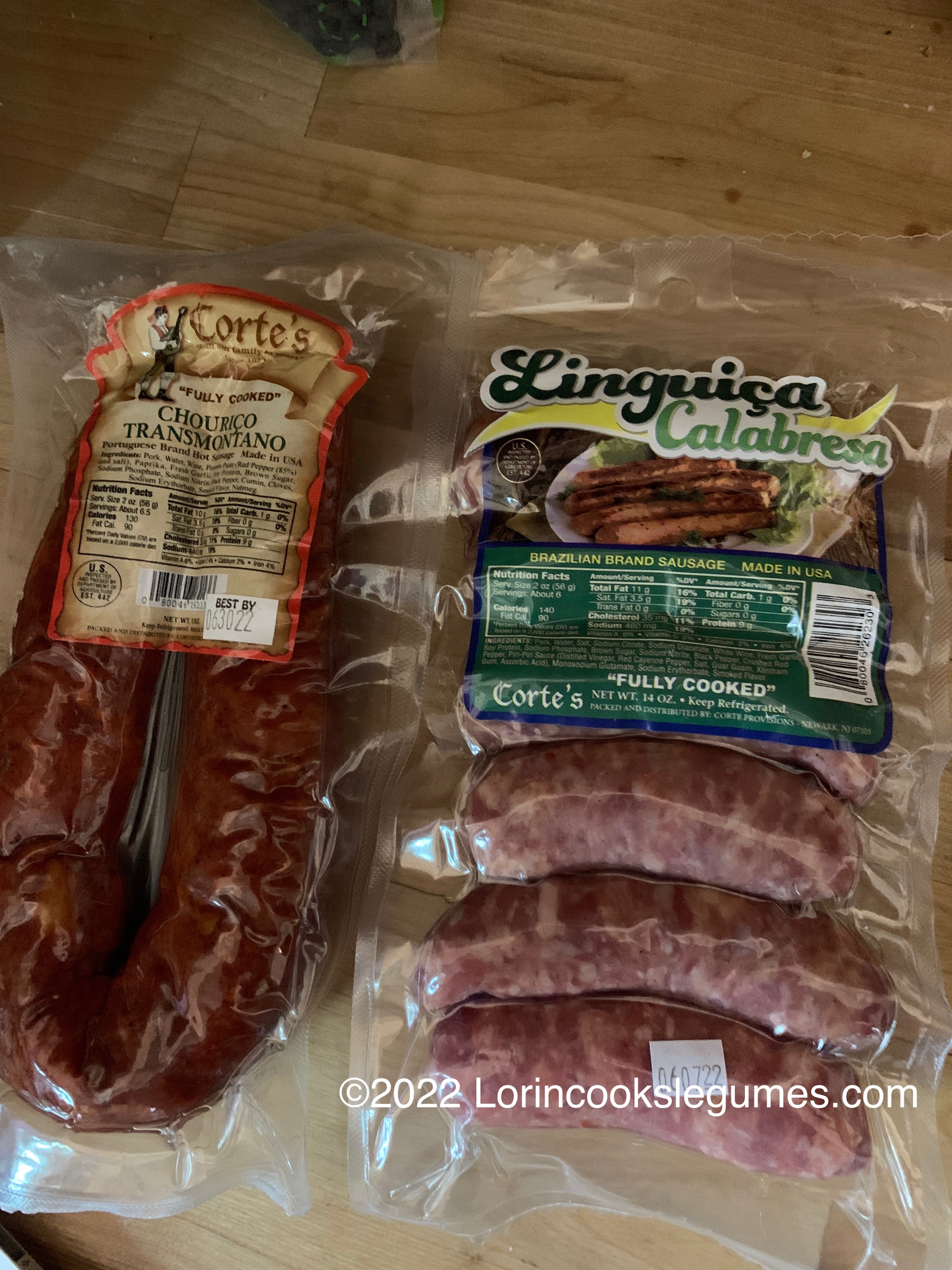 The two types of sausage called for in most of the Portuguese language recipes I looked at are Calabrese and Paio. Calabrese is a type of sausage that was introduced around the world by Italian immigrants from Calabria. You can find it online fairly easily, although I made sure to get a Brazilian version, as I suspect that there are variations to the recipe in different countries.