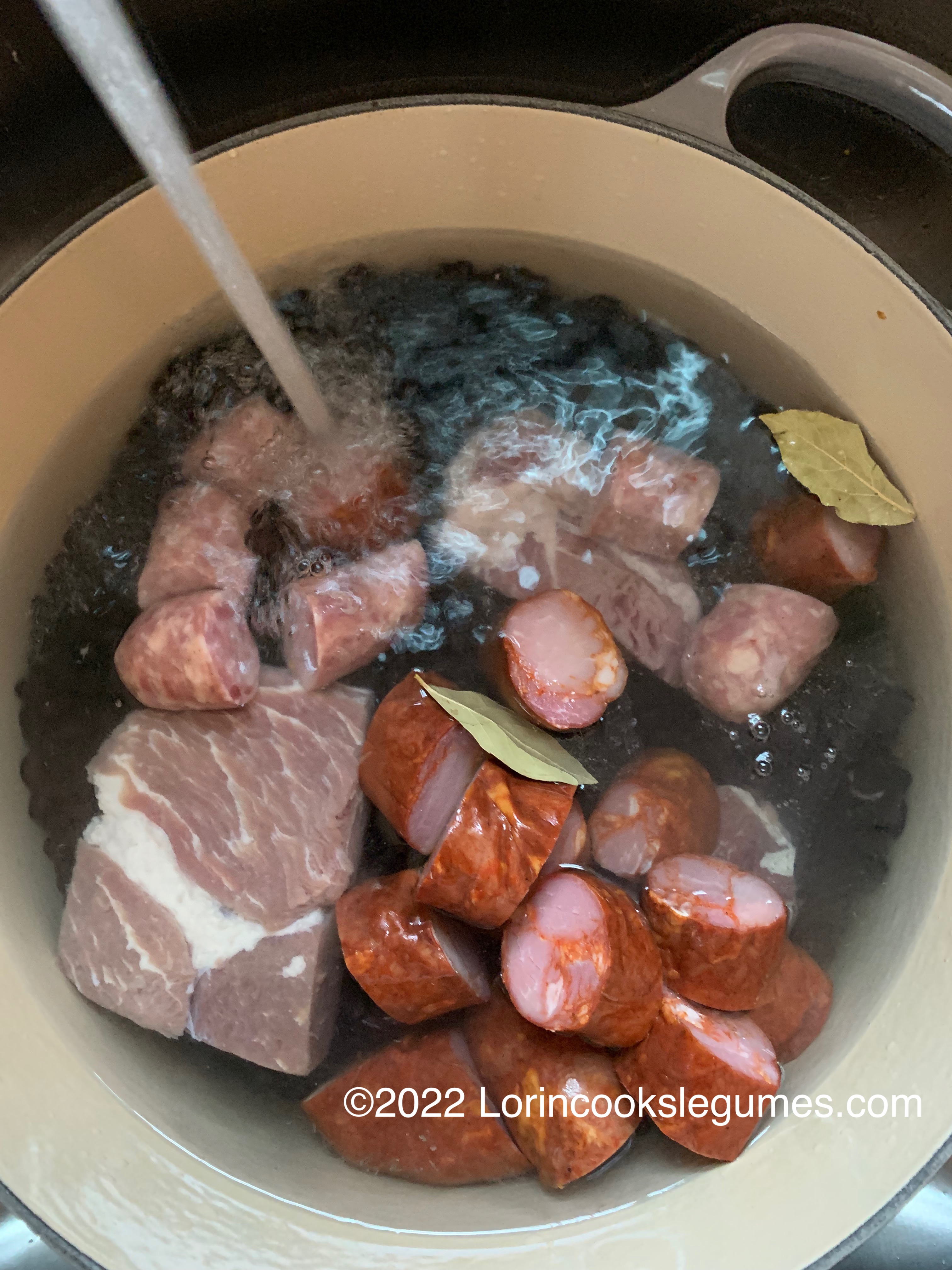 Meanwhile, drain the beans and carne seca. Place in another pot along with sausages, bay leaves and water to cover by about 2 inches. Bring to a boil, reduce heat and simmer for 1-2 hours.