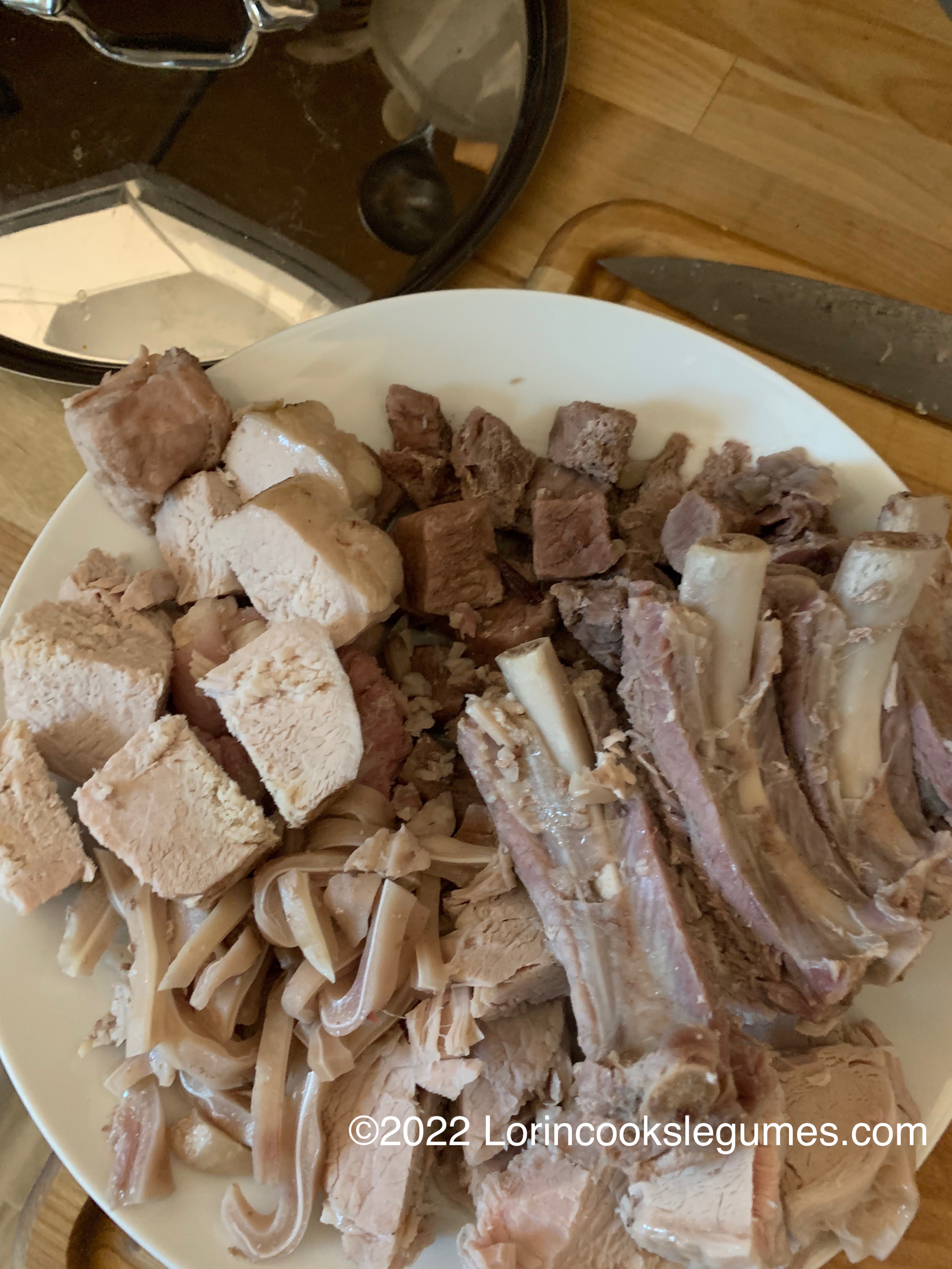 Drain salted pork and place in a large pot, along with fresh meats and enough water to cover. Bring to a boil, reduce heat and simmer for 1-2 hours. As the various meats are cooked remove them, cut into serving pieces and set aside.