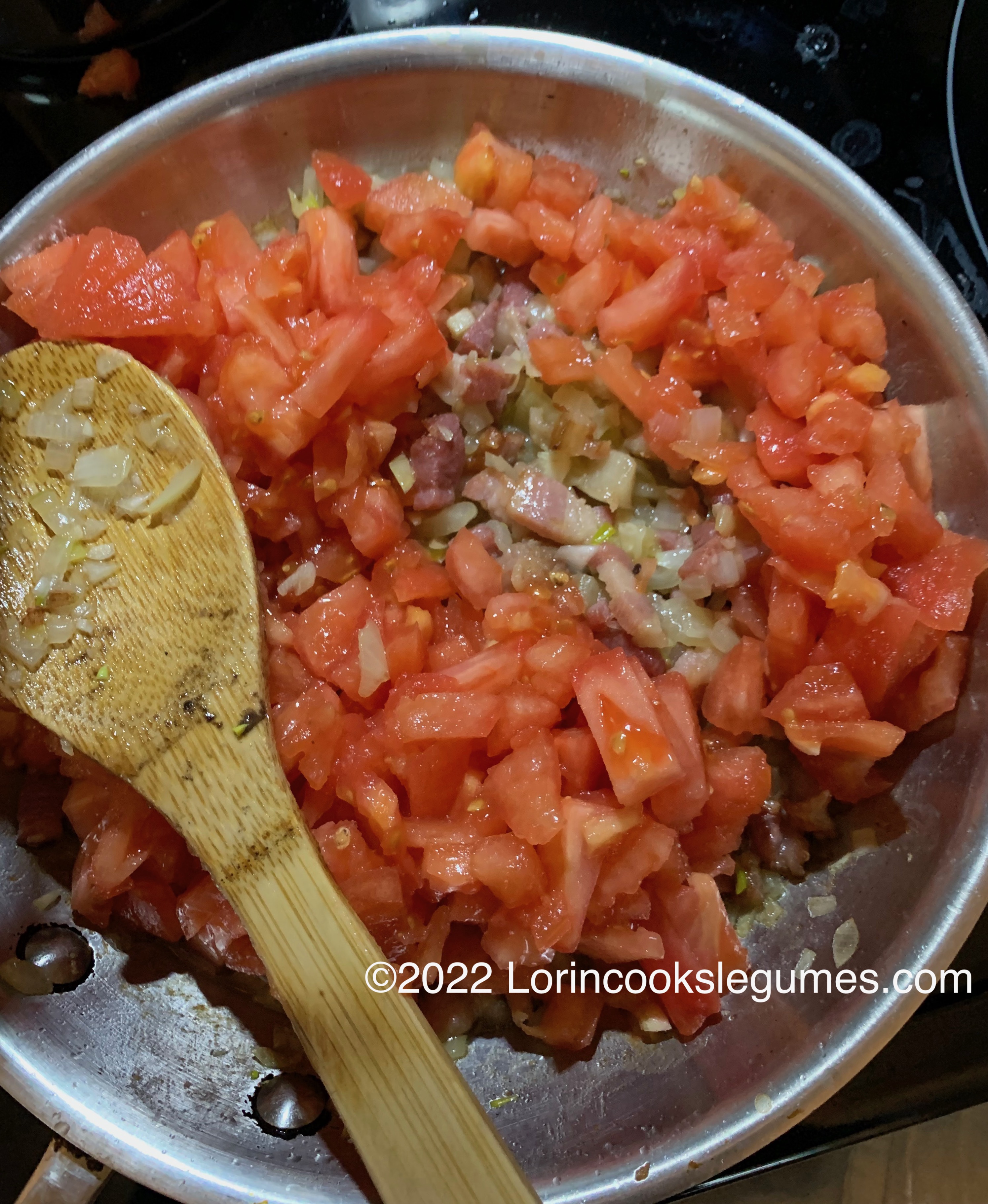 When beans are tender, heat olive oil and bacon in a sauté pan. When bacon is rendered, add onion and 4 cloves of garlic and sauté until translucent. Add tomato and cook for 5 minutes. Add a couple spoonfuls of beans and mash them with a fork. Cook and stir for 10 minutes or so. Return to the bean pot, along with meats.