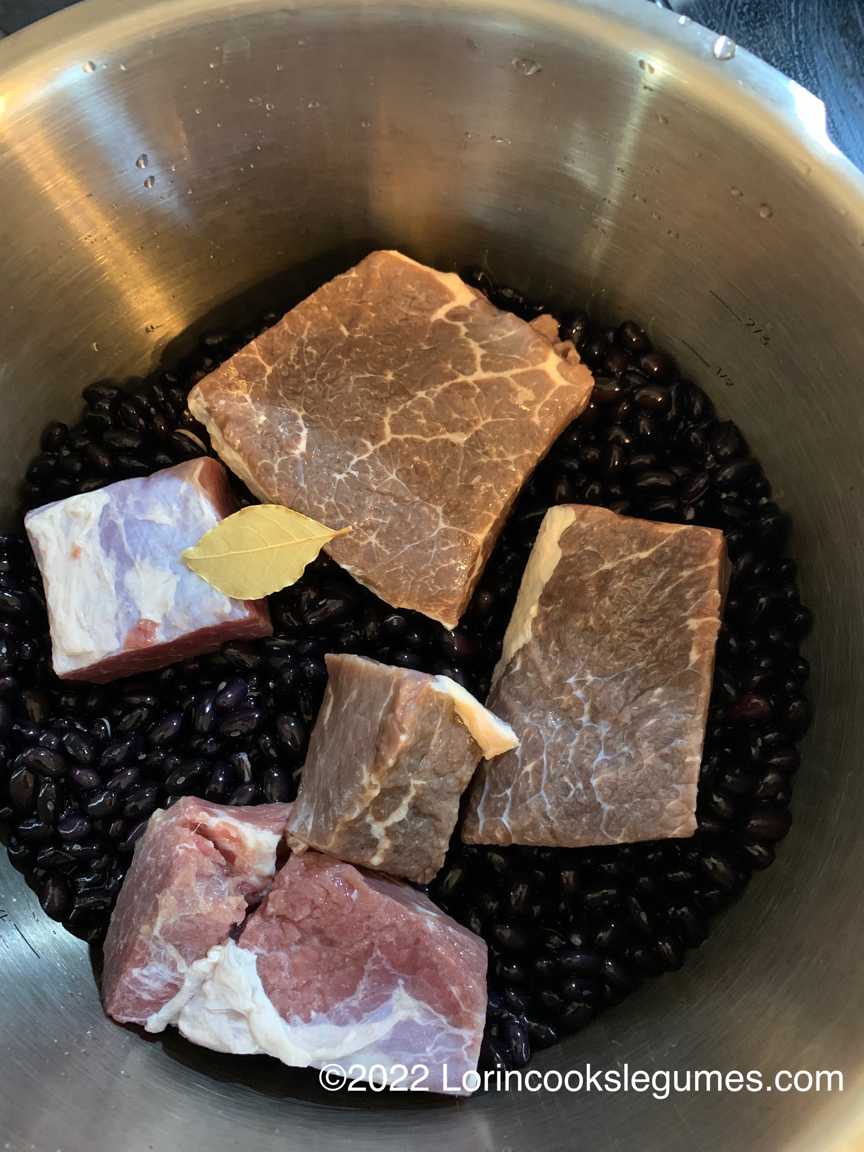 Drain the beans and charque, place in a pressure cooker with the bay leaf, and add water to the maximum fill level of your pressure cooker. Bring up to pressure and cook for about 15 minutes. Safely release pressure and transfer to a large bowl. Set aside.