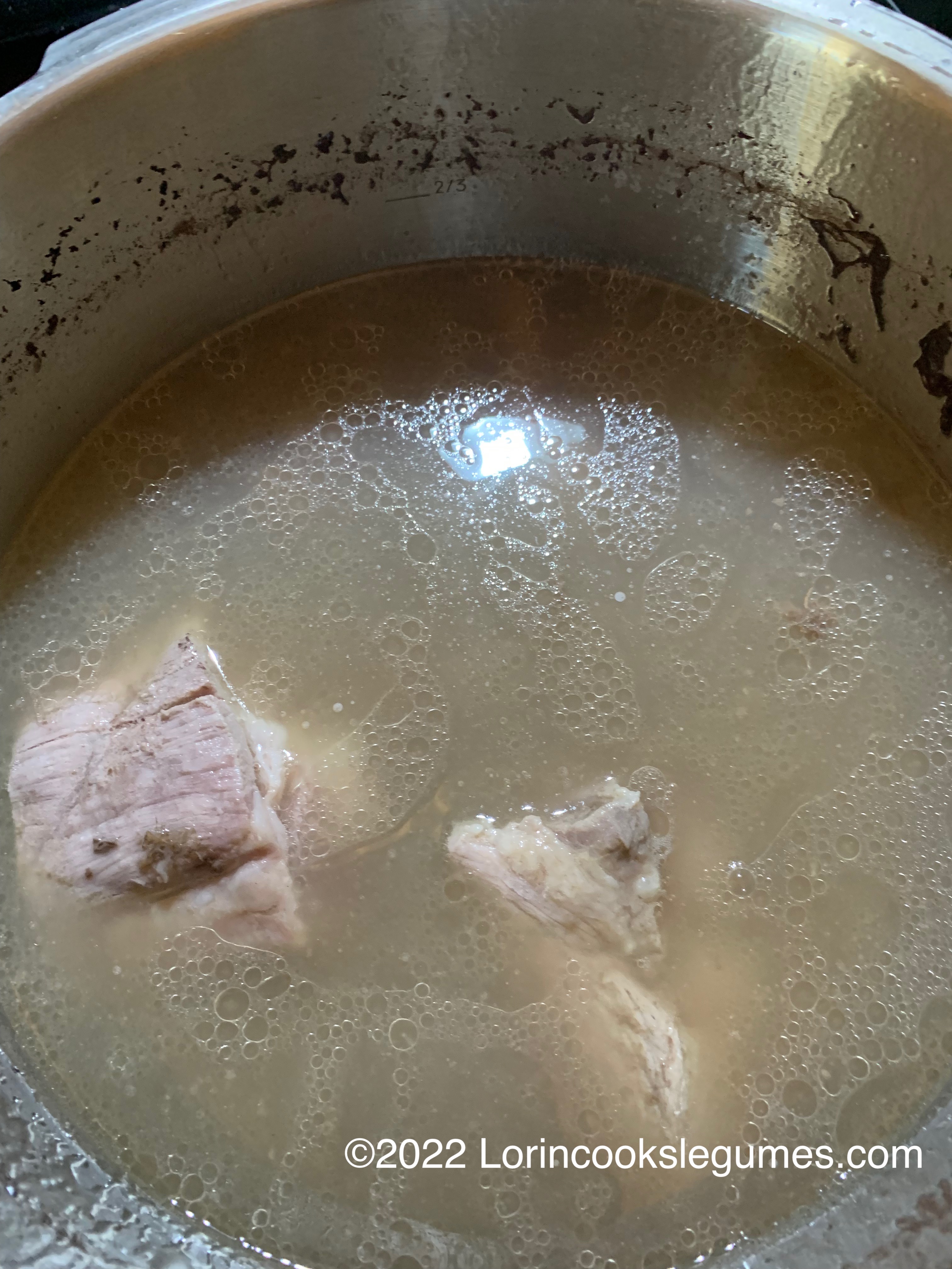 Place pork feet in pressure cooker with water to cover. Bring to pressure and cook about 20 minutes. Safely release pressure and add the ribs. Bring back to pressure and cook another 15 minutes. Safely release pressure and remove the meats. Allow to cool slightly, then remove the bones and chip meat into bite sized pieces.