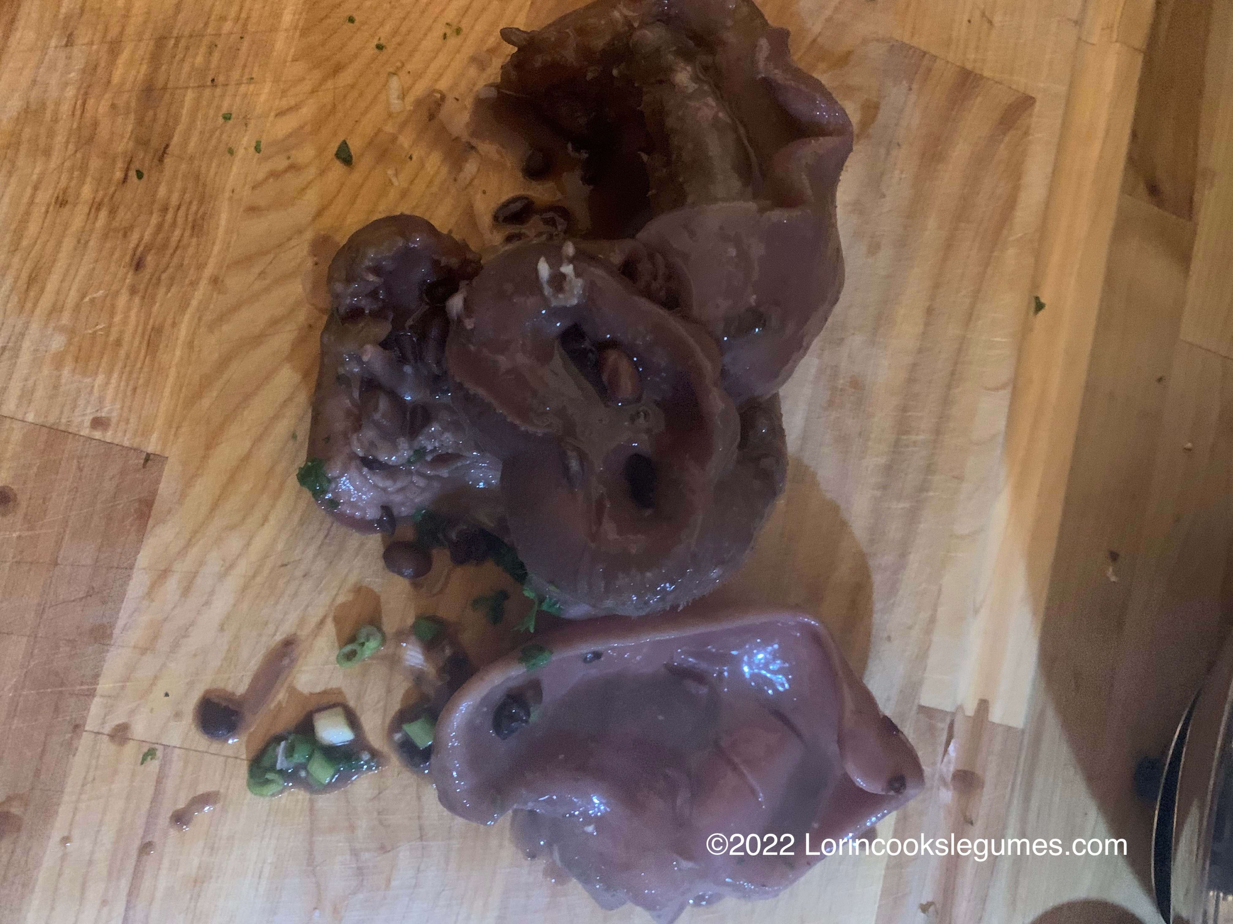 I chose to pick all the meat off the bones once it was cooked. I think in Brazil you will find the various bits cut into more manageable sizes, and you would generally just eat around the bones, but I’m not a big fan of doing that with all the tiny bones from a pigs foot- especially when I’m eating the leftovers at work. Snouts and ears don’t have bones, but are, in my experience, easier to cut into bite sized pieces once cooked, so I also threw them in whole and chopped them up at the end.
