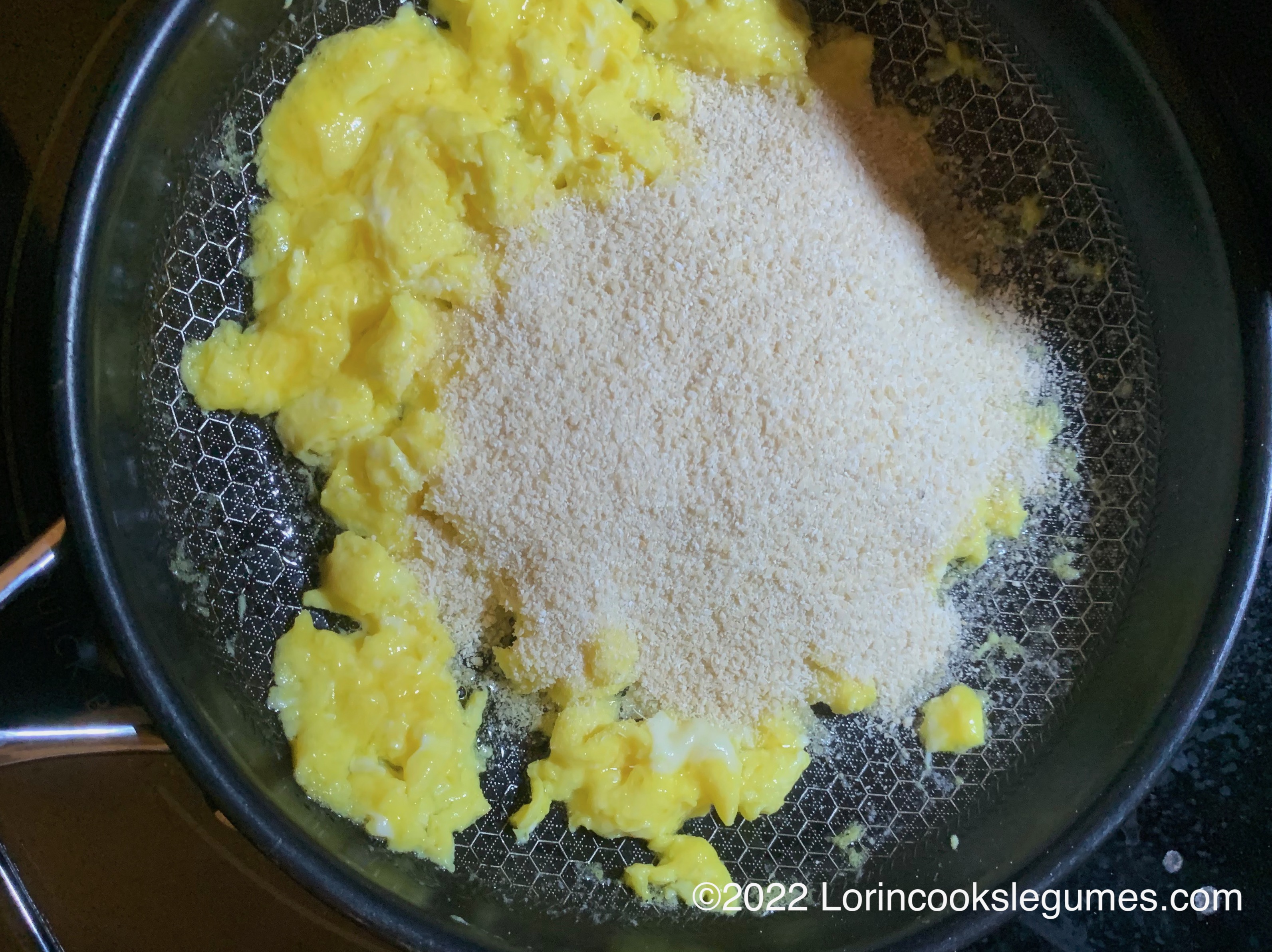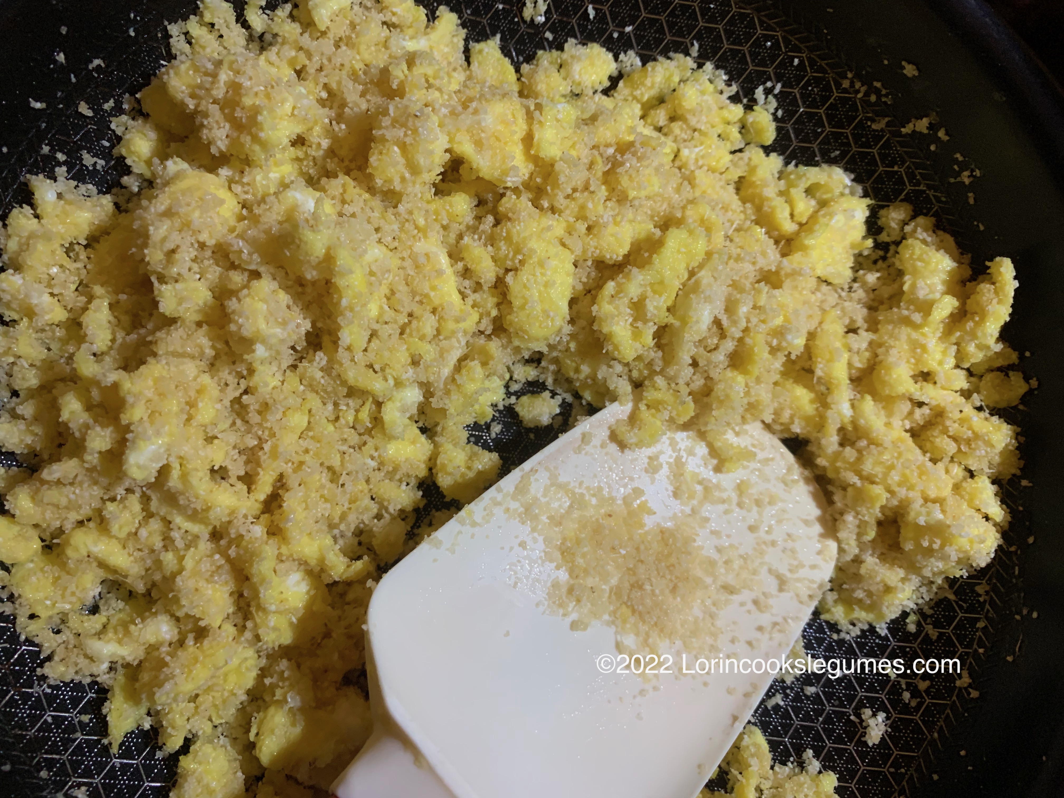 For the farofa, heat a couple tablespoons of olive oil and butter in a sauté pan. Add eggs and scramble, leaving in largish pieces. Add cassava flour and stir for a minute or two.