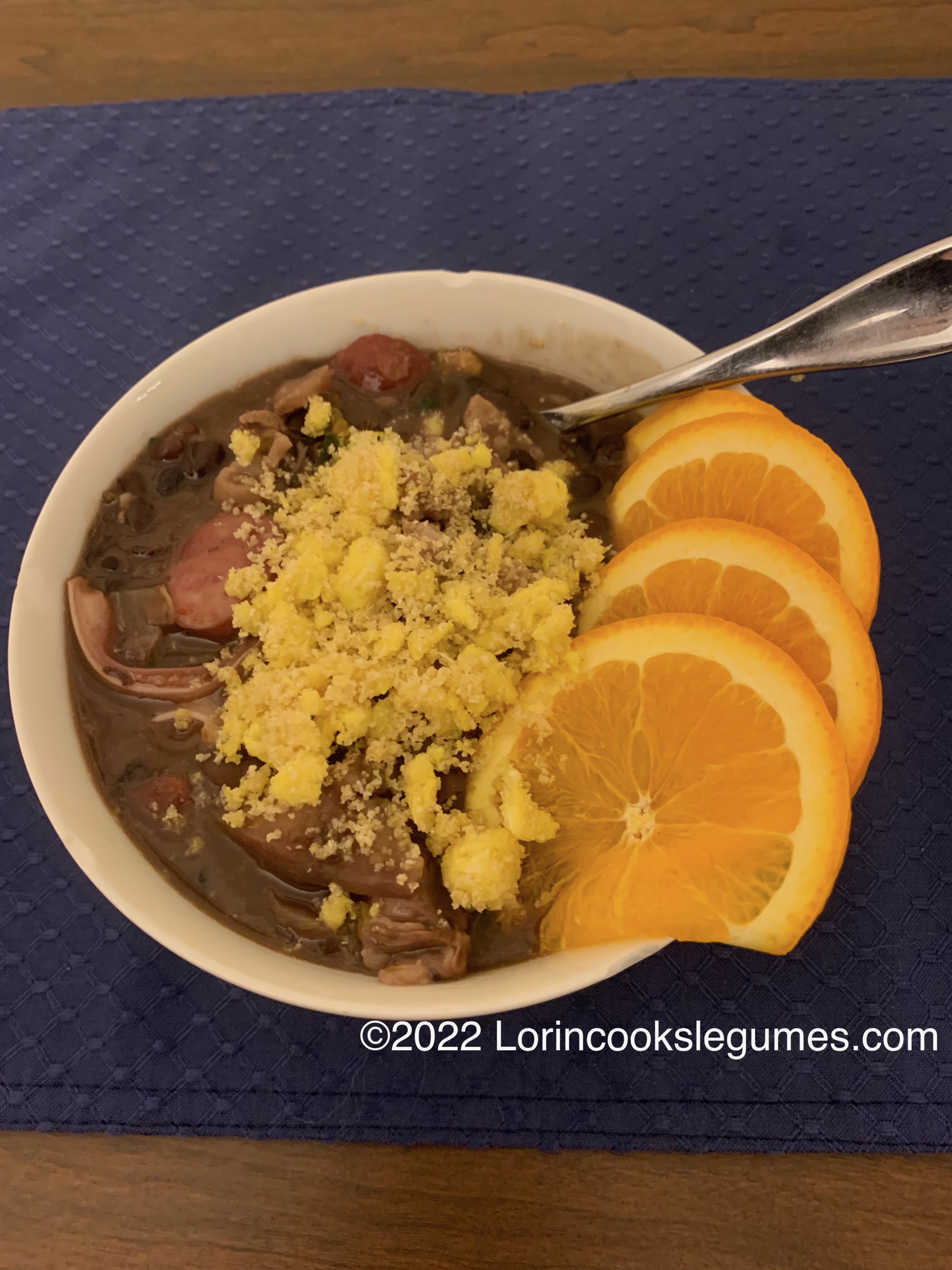 Serve the beans topped with farofa, with orange slices on the side.