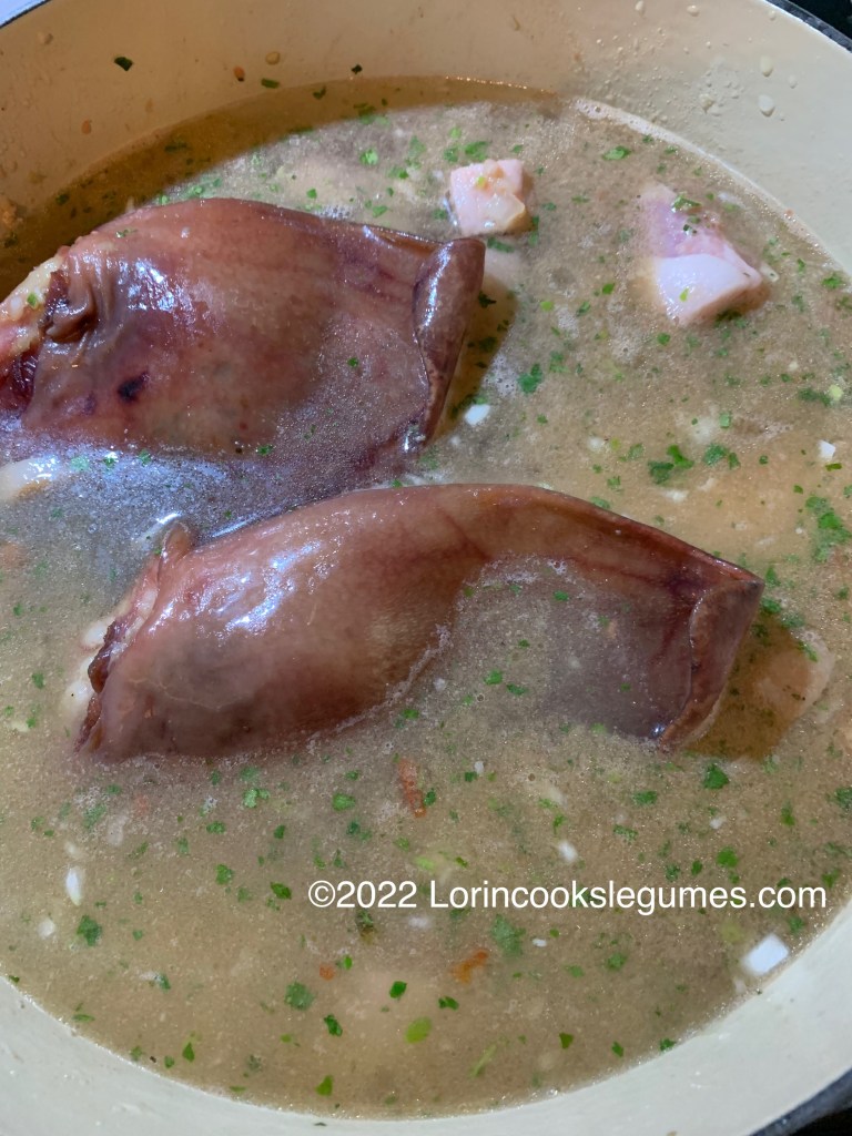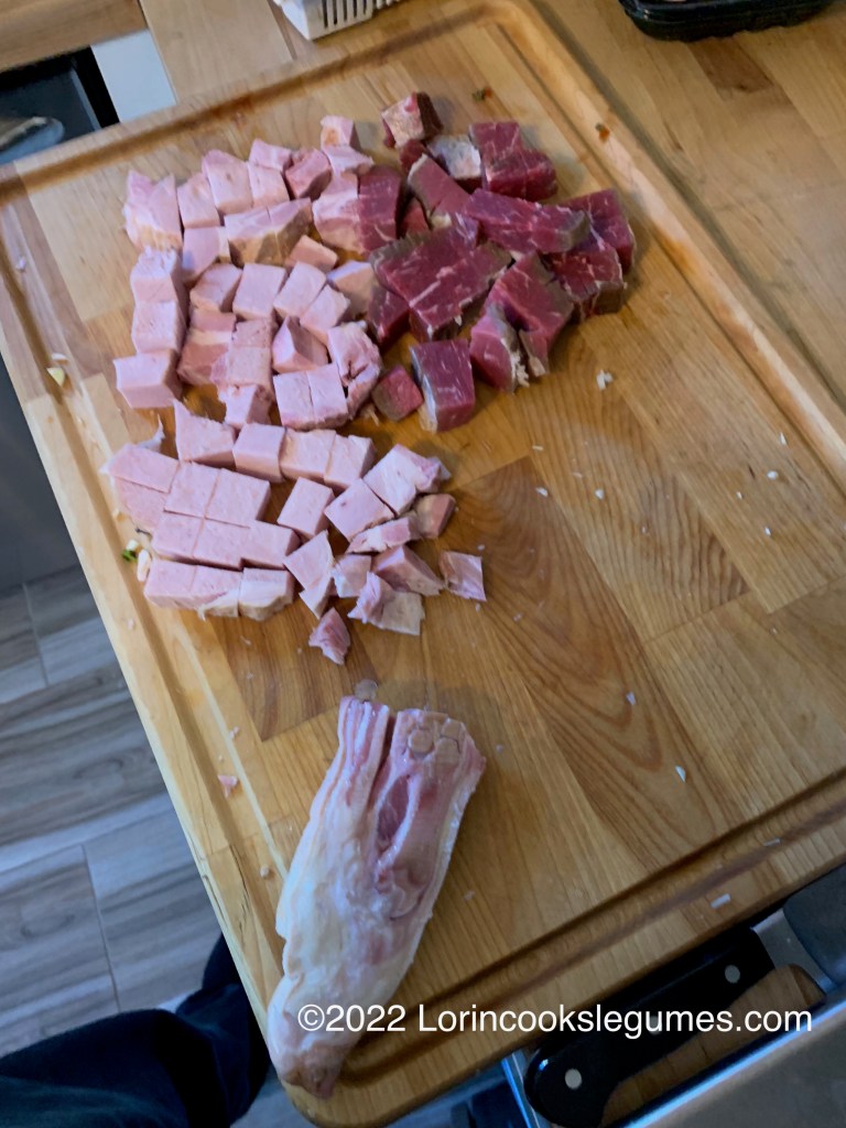 Drain the salted meats. Put the oil in a very large dutch oven or stock pot and add the bacon. Place over medium heat until the bacon fat starts to render. Add the remaining 1 onion, garlic and all the meats except the sausages. Sauté for about 5 minutes, then add the tomato-herb puree and cook for a few minutes. Add the bay leaves and water to cover, bring to a boil, cover the pan and reduce heat to simmer for about 30 minutes.