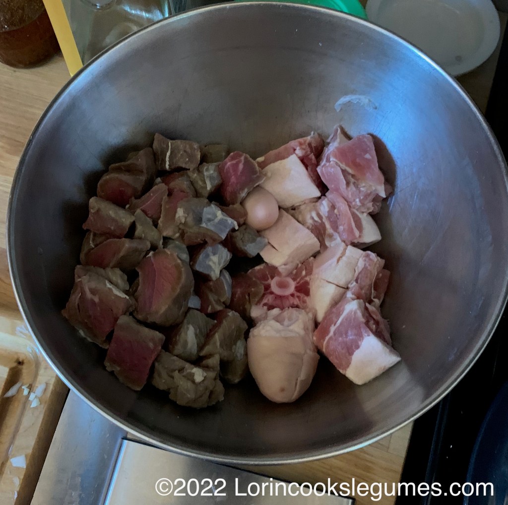 Cover salted meats with cold water, and leave to soak in the refrigerator for about 24 hours, changing water 2-3 times.