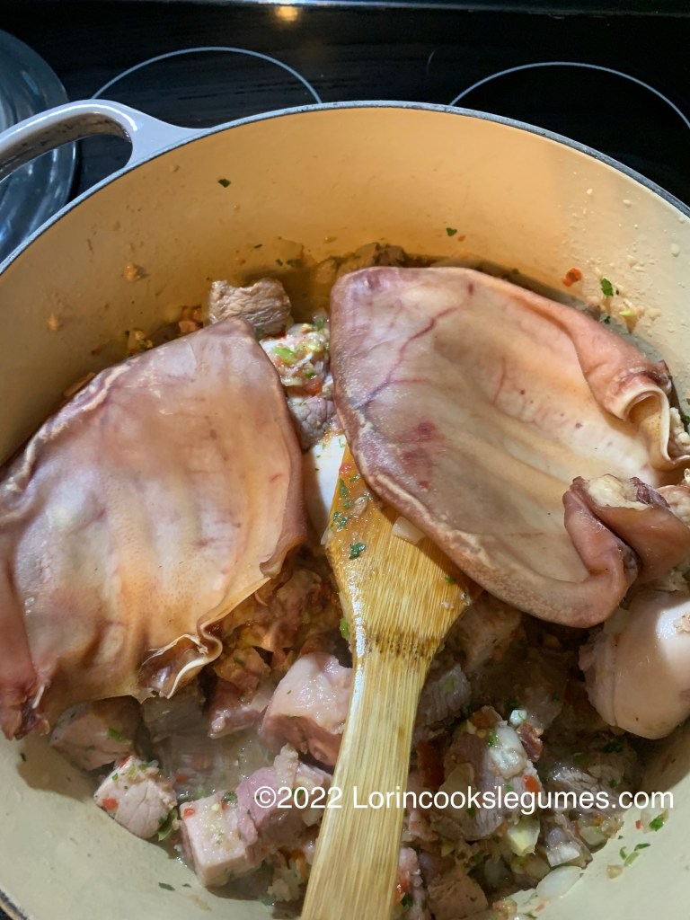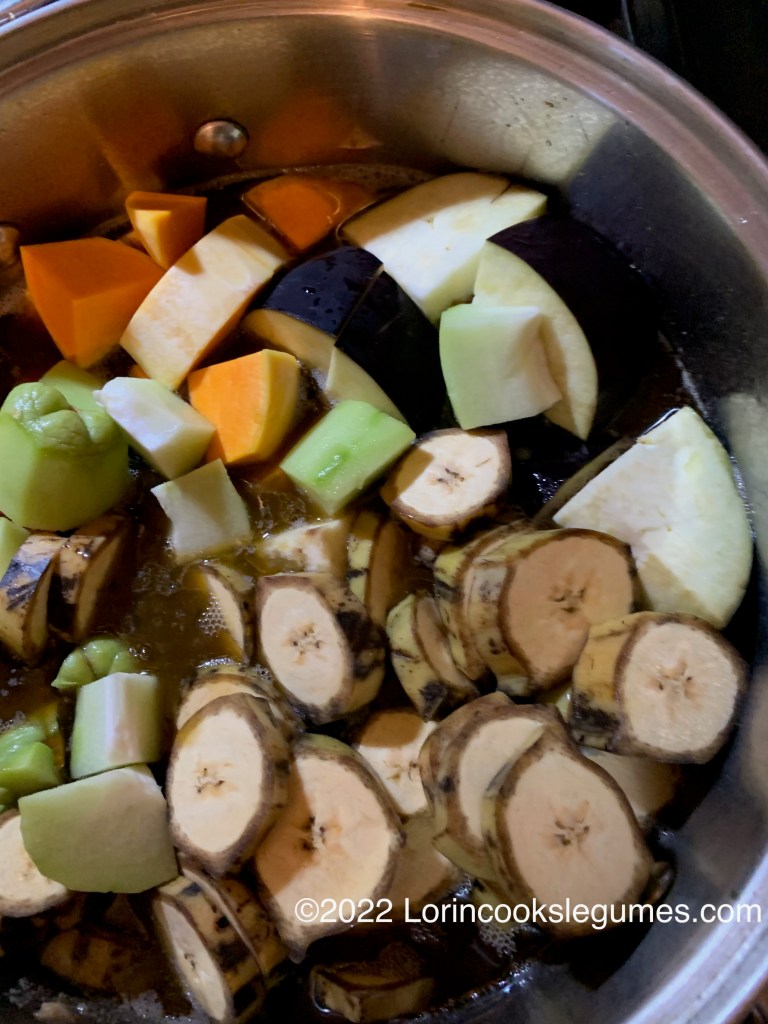 Once the beans are nearly cooked, add the pumpkin, eggplant, chayote and plantains. Simmer for about 10 minutes.