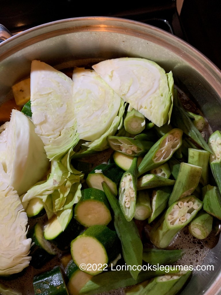 Add the okra, cabbage, and maxixe or zucchini. Simmer for another 10-15 minutes, until vegetables are just tender. As the various vegetables are cooked, remove them to a separate serving platter and keep warm.