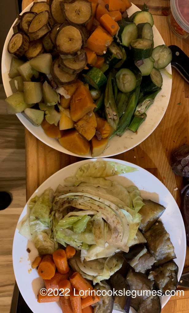 All these various vegetables are generally cooked by putting them on top of the beans, without stirring them in. As they are cooked they are removed and served on the side. Feel free to omit or add vegetables depending on what you like. Just think about how long they will take to cook, and add them at the appropriate time- hard vegetables like sweet potatoes and carrots earlier, tender veggies like cabbage and okra at them end.