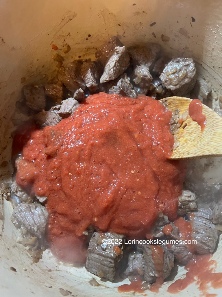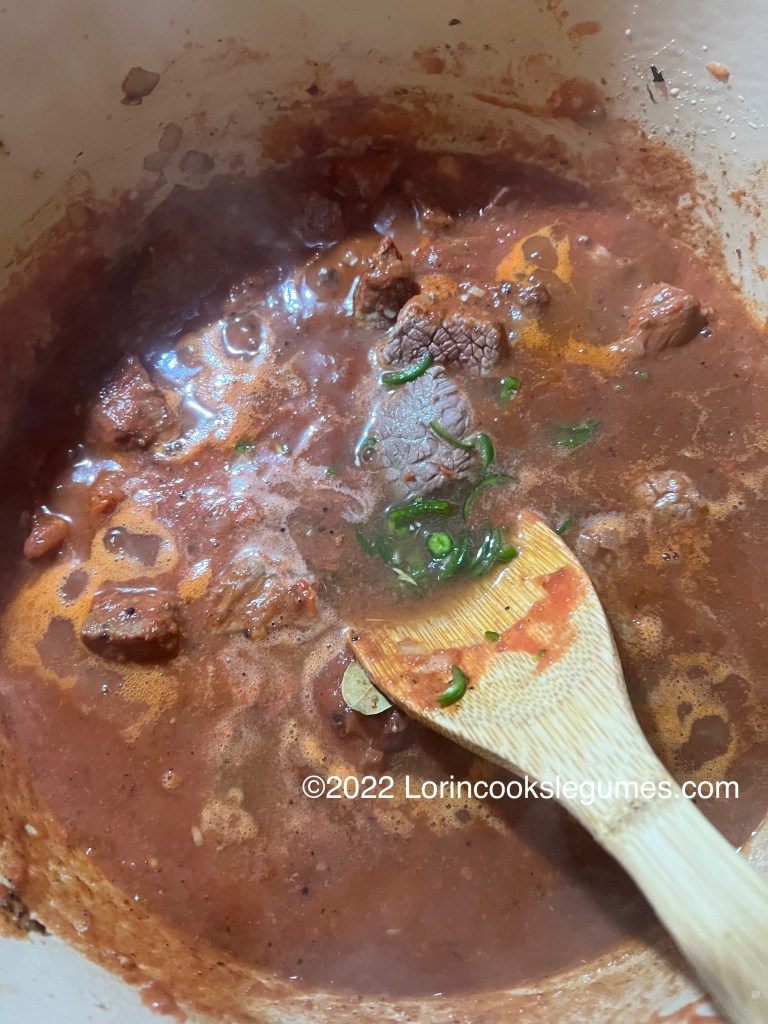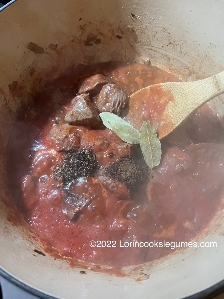 Heat oil in a heavy pot and add the onions. Sauté until golden. Add the meat, season with a little salt, and brown on all sides. Add garlic and cook for a minute or two, until fragrant, then add the tomato juice mixture, along with the black pepper, allspice, bay leaves chicken broth, and chili pepper. Bring to a boil, reduce heat, and simmer, covered, for about 20 minutes.