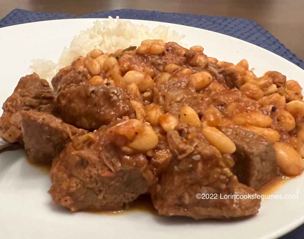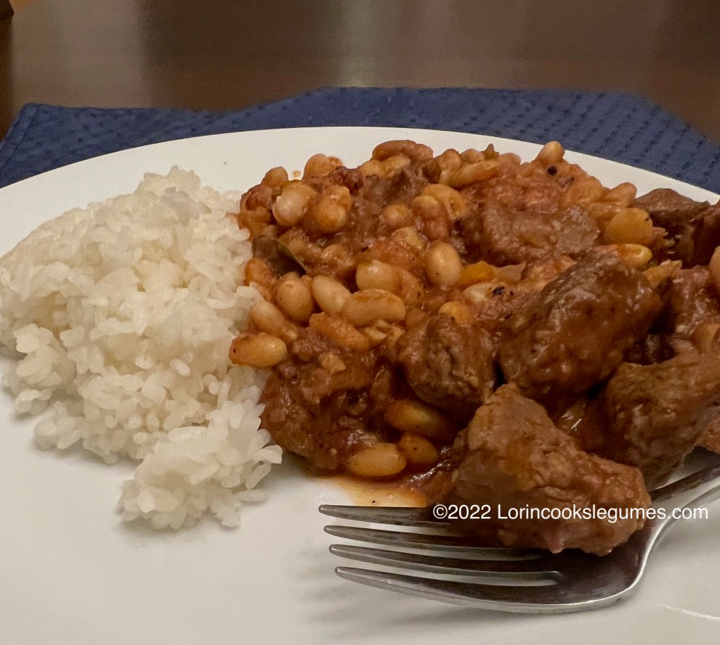 My version wound up looking kind of like baked beans, with a fairly thick, brownish sauce, compared to the fairly liquid, tomato colored sauce I saw in most of the photos on other recipes. I believe that my recipe wound up with quite a bit less tomato than most of my source recipes, probably because most of my sources didn’t list a number of servings and I wasn’t as carful about trying to adjust the numbers to they were all making the same size batch as I usually am, so the allspice to tomato ratio lead to a pretty dark sauce that just got darker with the long simmer. Which is to say I’m not convinced I came up with exactly what you’d get if you ordered fasoulia in Egypt, but it is delicious.
