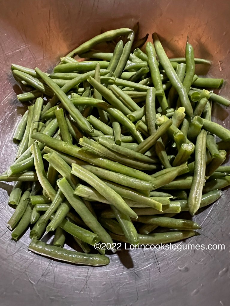 Trim the stems and tails from your green beans, and snap in half if they are excessively long. Set aside.