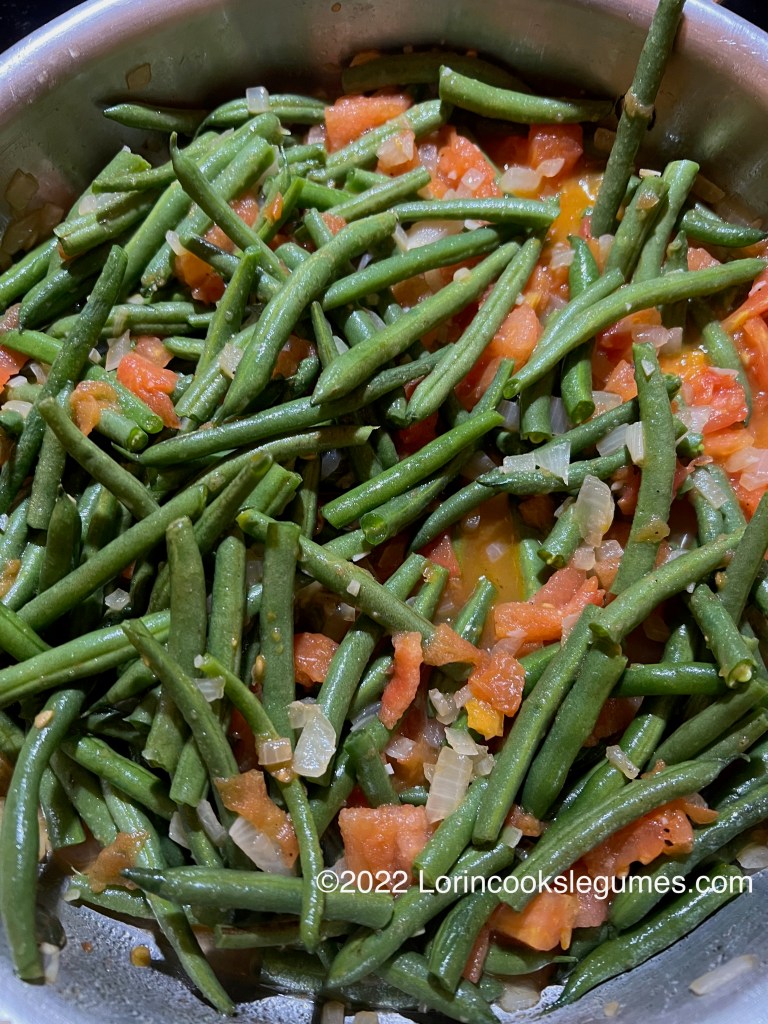 Add the green beans and ½ cup hot water. Stir to coat beans with tomato, cover, and allow to simmer, covered, for 30-45 minutes, until the liquid is absorbed and the beans are soft and infused with the flavors of the sauce. Do not stir too frequently- once or twice should be enough. If things start to stick you can add a little more water and scrape the browned bits off the bottom of the pan.