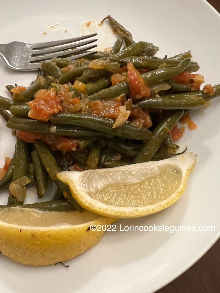 Of course Israel has one of the great “melting pot” cuisines of the world. Jews emigrating from all over the world have brought the foods they were used to eating, and it has all blended together with the dishes of the Arab populations they have displaced. The most common name I saw for the dish, when I searched for “Israeli fasouli”, was Sephardic green beans, but I also saw it called Turkish green beans, and the same dish is also served in all the various Arab nations around Israel, so it’s not entirely clear if it came with the Sephardic Jews from the Iberian peninsula, or if they were just the first group of Jews to adopt the local dish into their repertoire. Rather than give credence to one group or another’s claim on the dish, I’m choosing to use the Arabic name, fasoulia bi zeit, literally “beans with oil”.