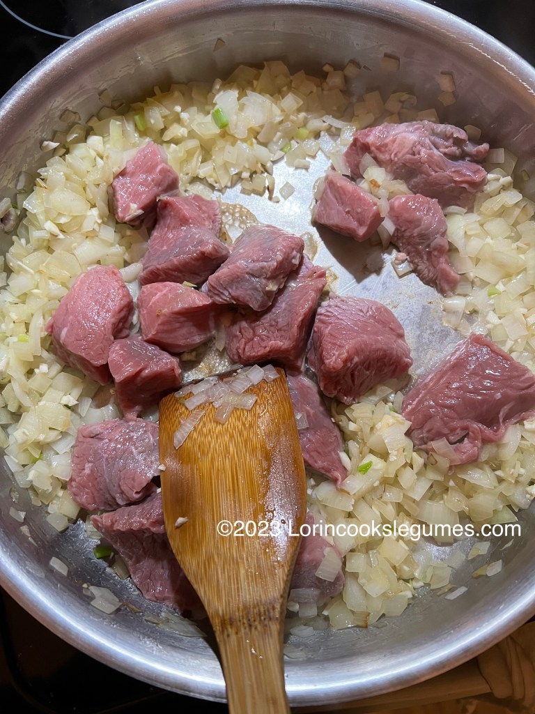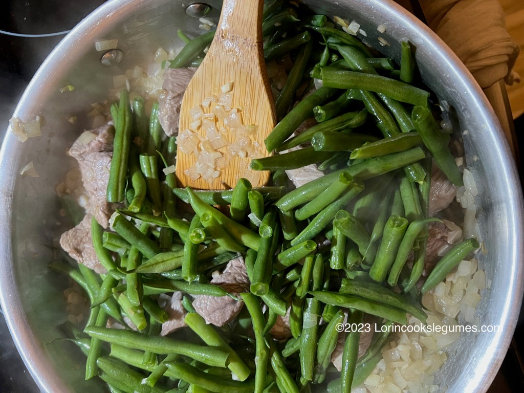 Drain the meat and pat it dry, then add it to the pot with the onion and fry until brown on all sides. Add the green beans and cook for 5-10 minutes, until they just begin to soften.