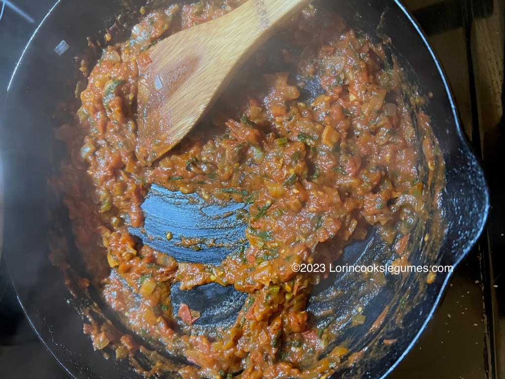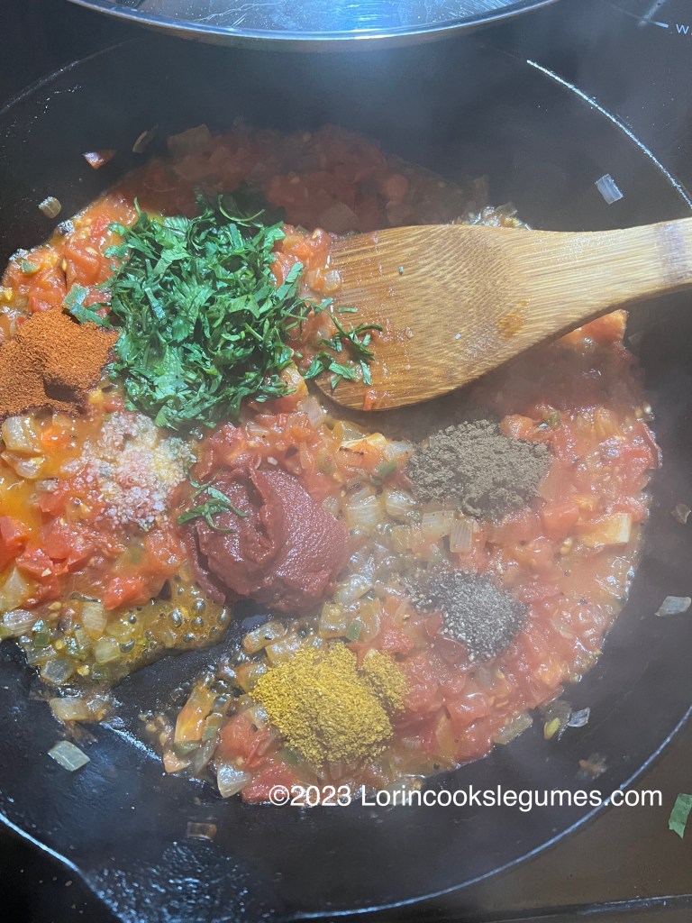 Stir in the tomato paste, cilantro, salt, pepper and spices. Add a little water if needed to help the tomato paste dissolve. Cook, stirring frequently, for about 5 minutes.