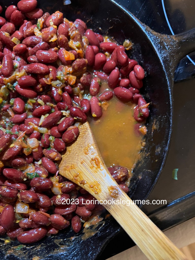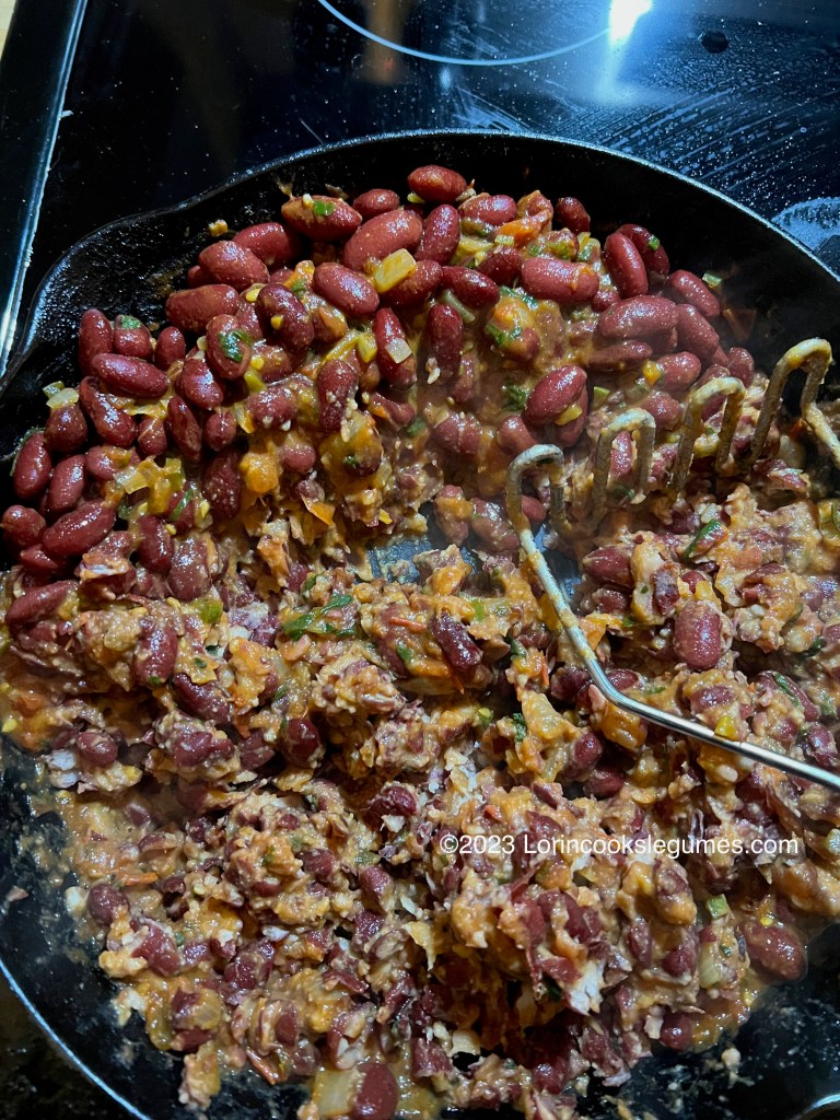 Add the beans and ½ cup of water. Bring to a simmer and use a potato masher or the back of a heavy spoon to smash about half of the beans, or until the mixture reaches your desired consistency. Raise the heat slightly and cook without stirring for a few minutes, until the bottom dries out and begins to form a crust (but don’t let it actually burn). Stir well, scraping up the fond from the bottom of the pan. Repeat this pattern of forming a crust and scraping it up 2-3 more times. If desired, add a little more water to loosen mixture.