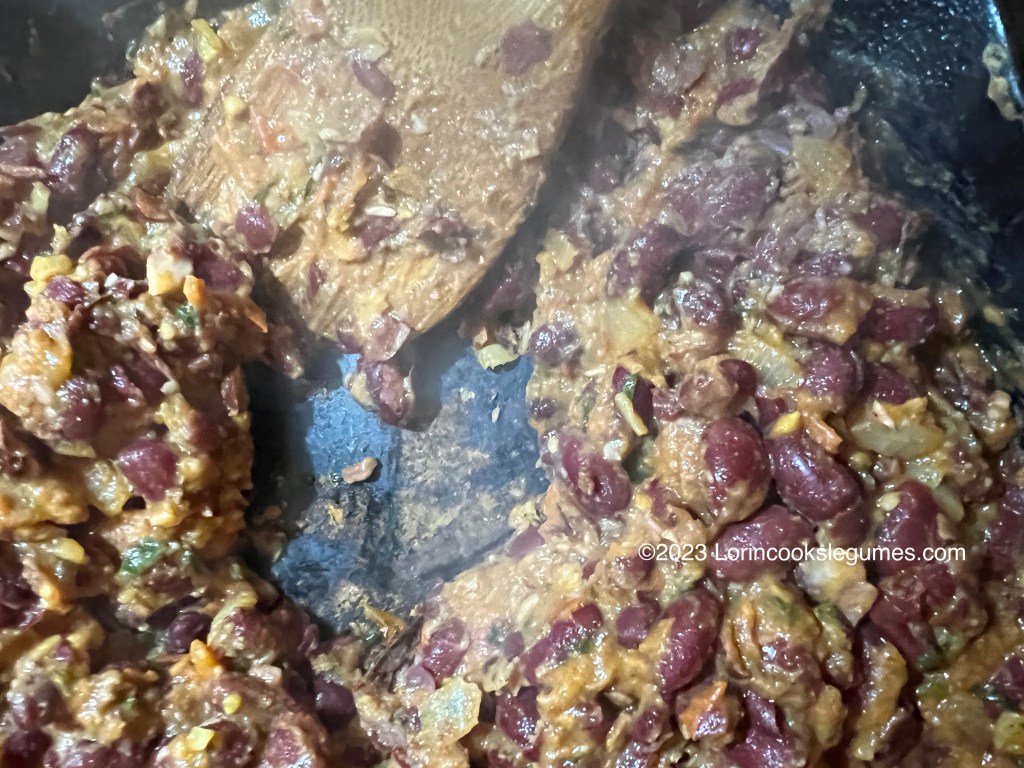 Also, feel free to add additional water if you like. While the process of allowing the beans to dry out and form a crust adds flavor to the dish (do be careful not to actually burn them though!.. that’s not the desired flavor), it does make for a pretty thick paste. If you like your beans a little looser you can either skip that step, or add more water afterwards.